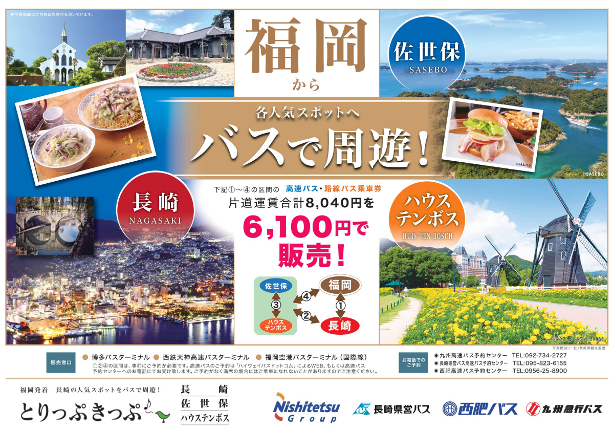 福岡~長崎・佐世保・ハウステンボスを結ぶ高速バス片道乗車券3枚と佐世保~ハウステンボスを結ぶ一般路線バス片道乗車券1枚をセットにし、割引価格で販売いたします。
