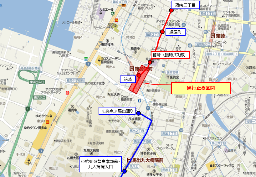 ・運休区間 箱崎三丁目方面:「箱崎~箱崎三丁目」間 ※馬出通りバス停が終点