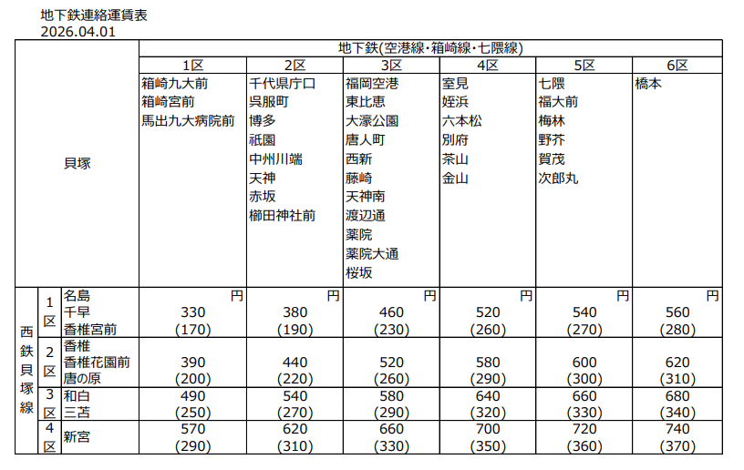 乗り継ぎ割引(西鉄貝塚線⇔福岡市地下鉄)