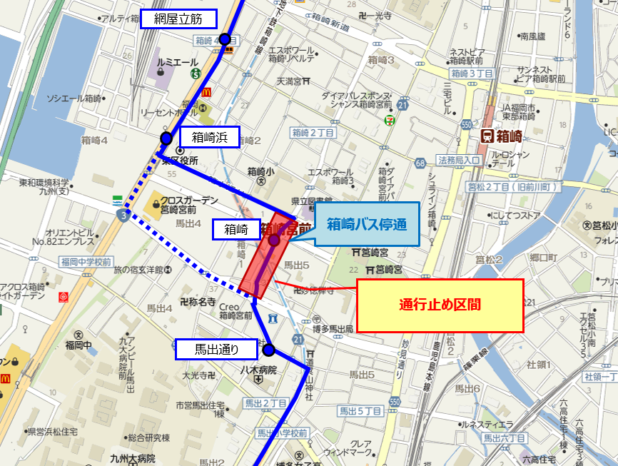 ・運休区間 箱崎三丁目方面:「箱崎~箱崎三丁目」間 ※馬出通りバス停が終点