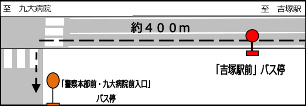 ■内容『吉塚駅前(県庁方面)』のバス停を封鎖し、迂回運行を行います。県庁方面のバスをご利用の際には、『警察本部前・九大病院入口』をご利用ください。なお、吉塚営業所方面のバスについては通常運行いたします。