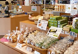 八女茶を始めとした市内各地域の美味しい加工品や特産品が並びます。お土産にどうぞ。抹茶ソフトも人気。
