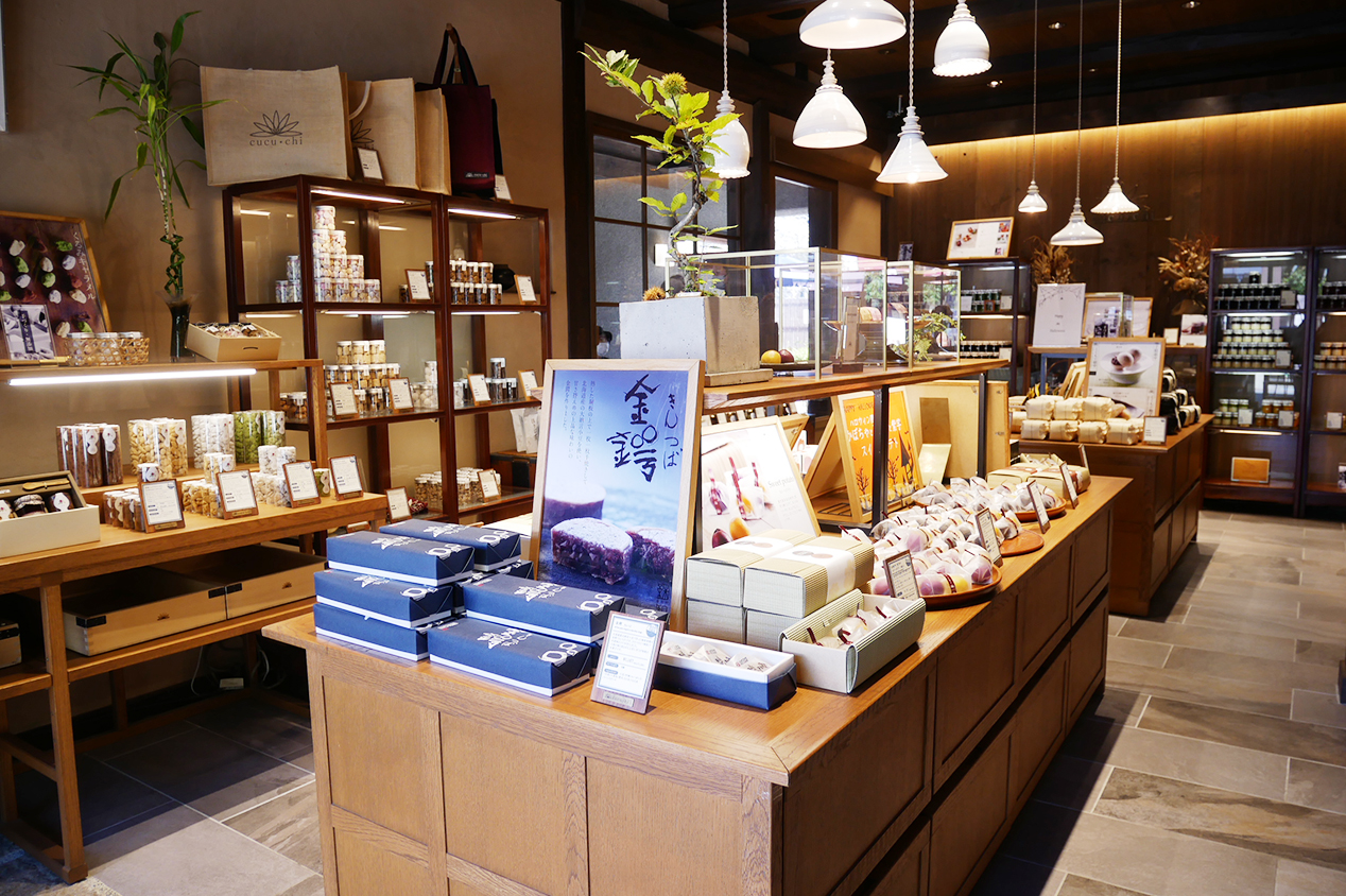 飲食店やおみやげ店が立ち並ぶ「湯の坪街道」で、ひときわ賑わいを見せる「鞠智(くくち)」。できる限り地産地消の素材を選び、一つひとつ職人の手で作られる和洋菓子を販売しているお店です。「温故知新の心を大切に、長く親しまれているものを鞠智流にアレンジして“どこにでもあるけれど、どこにもないもの”をめざしています」とマネージャーの菊池武久さん。
