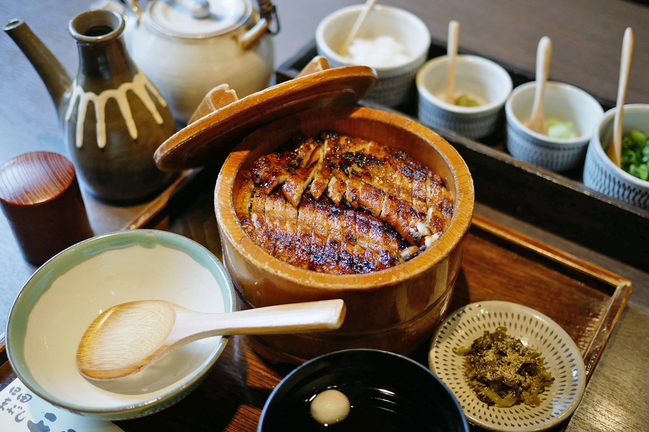 「日田まぶし」(並3,500円)は、国産うなぎのかば焼きを細かく刻み、ごはんに載せた名物料理。1杯目はそのまま、2杯目は柚子胡椒や大根おろしなどの薬味を入れて、3杯目は出汁を注ぐなど思い思いの食べ方を楽しめます。