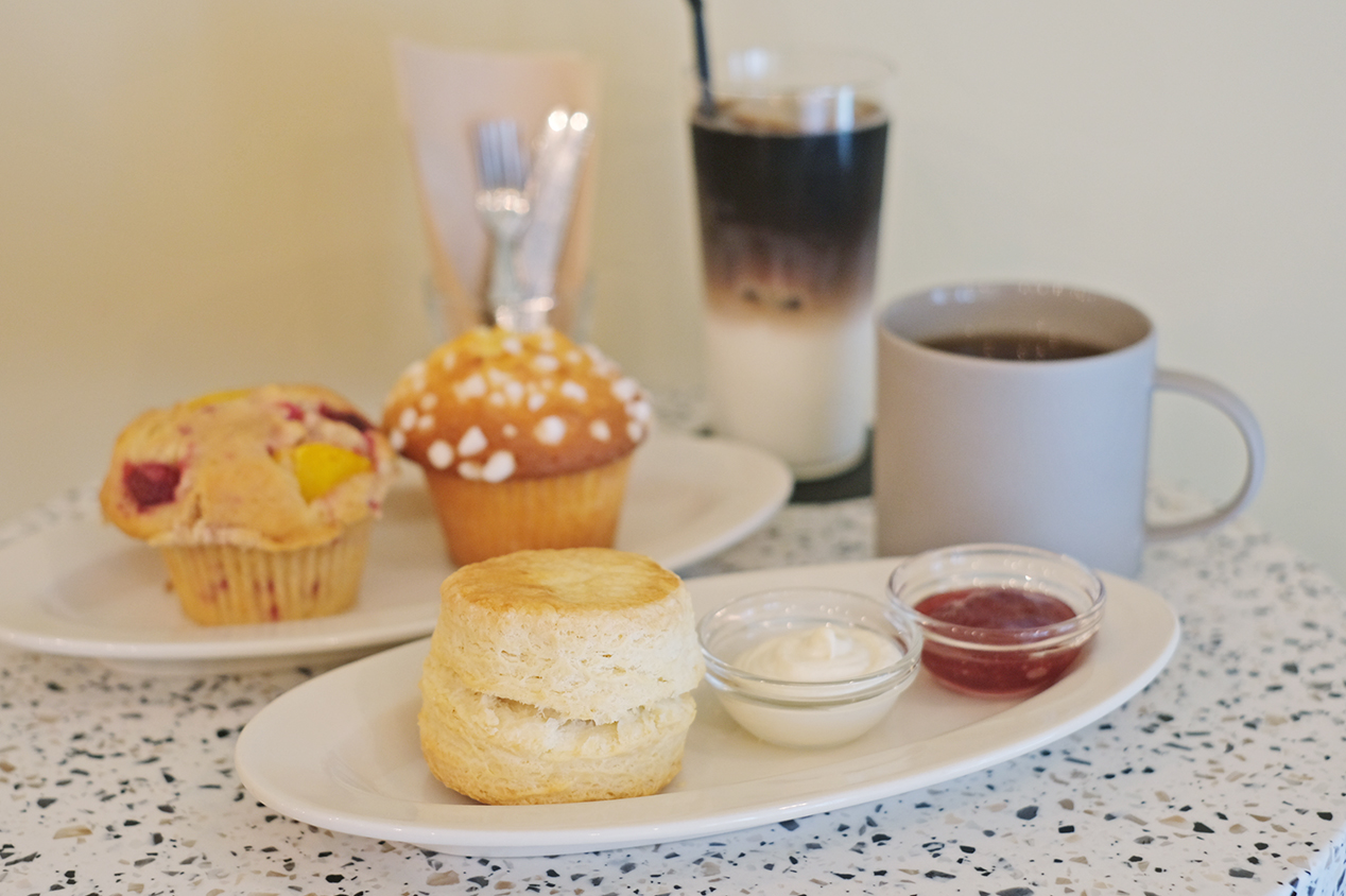 鋳物ホーロー鍋で知られる「バーミキュラ」の鍋で焼いた大きな「鍋焼きマフィン」などの焼菓子も人気。そのほかにレモンケーキ、デザートを盛り合わせたプレートなどもあります。