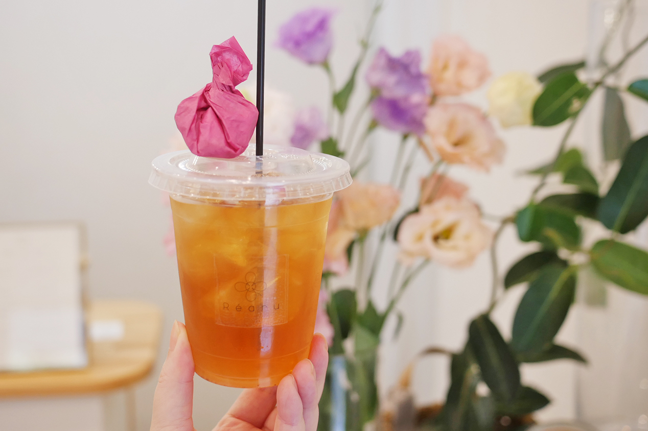 エディブルフラワーを浮かべた「和紅茶アイスティー」(480円)も(テイクアウトのみ)。国産茶葉をベースに果実やハーブが香る9種類のフレーバーから選ぶことができ、クッキーやメレンゲなど焼菓子が付いているのもうれしいですね。茶葉の購入も可能です。