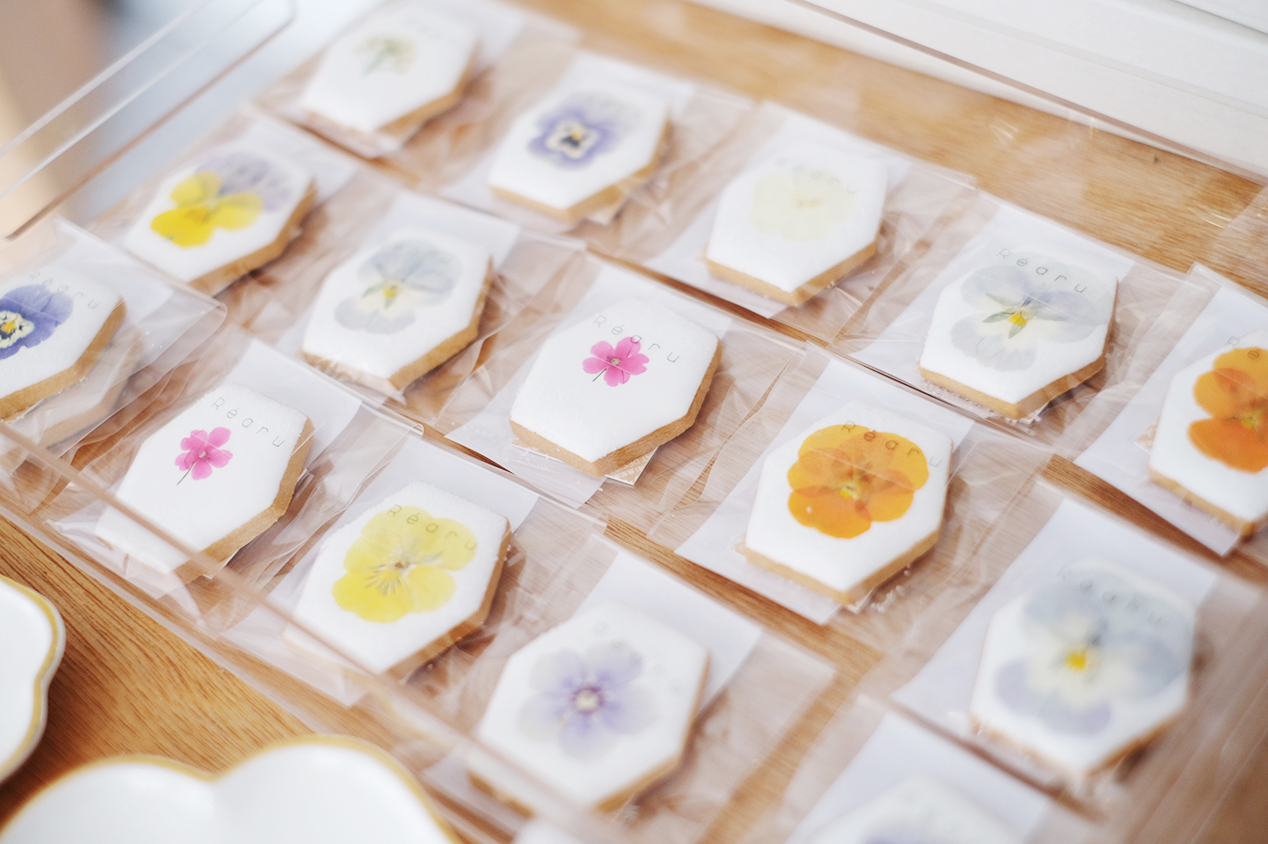 そして誕生したのがお店の看板商品「お花クッキー」(各280円)。北海道産「よつ葉バター」などを選び、保存料や着色料は使用せずに作ったクッキーにアイシングを施し、エディブルフラワーの押し花をあしらったものです。押し花はカラフルなビオラやバーベナなどの種類が用意されています。