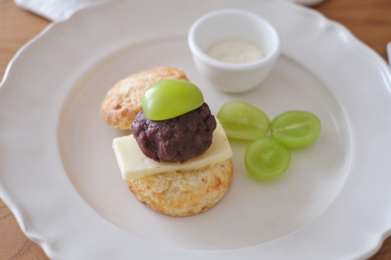 プレーンスコーンに有塩の「よつ葉バター」、自家製あん、季節のフルーツがのり、生クリームとマスカルポーネーズを合わせた特製クリームが添えられています。すべてを一緒に食べると、スコーンの香ばしさやフルーツのフレッシュ感、甘さ、コク、ミルキーな風味などが見事に調和し、至福のおいしさが広がります。