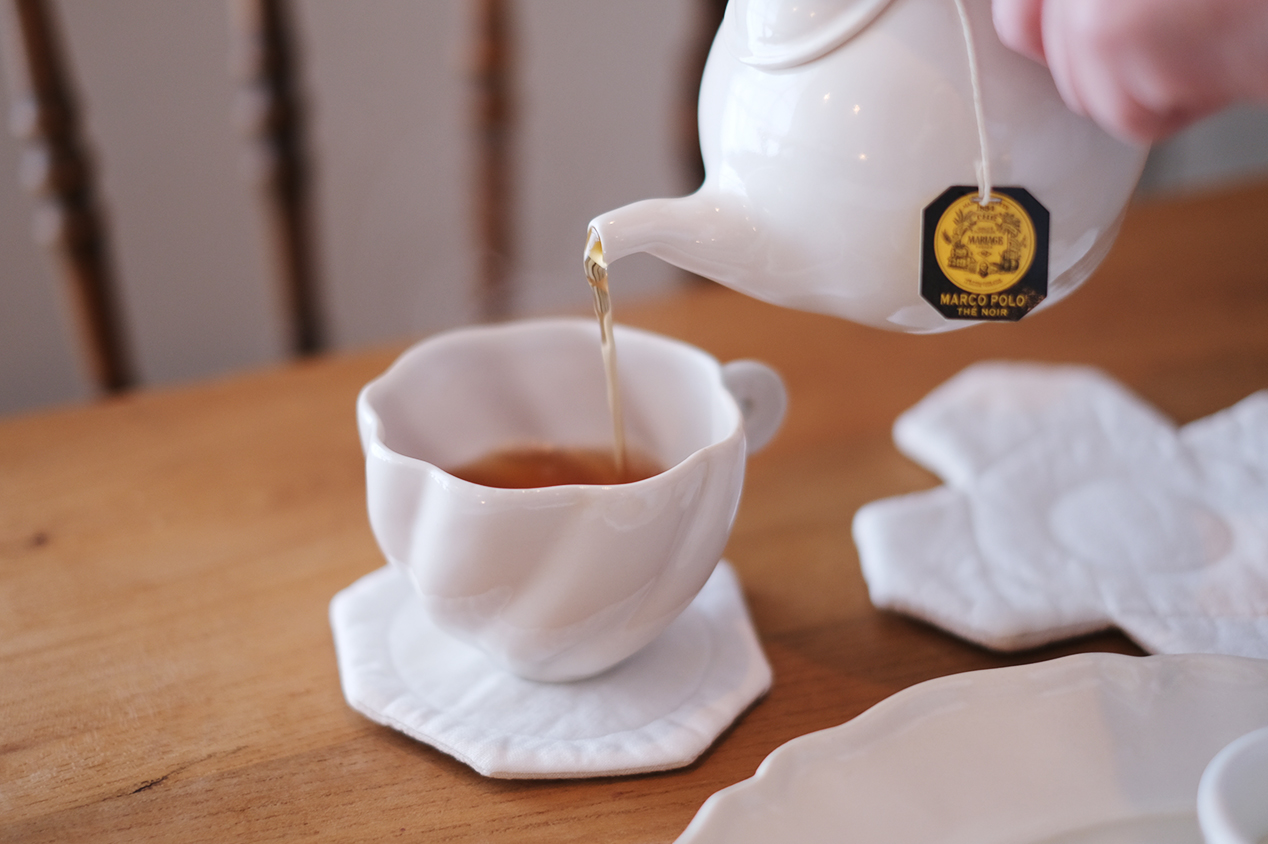 セットドリンクは紅茶やコーヒーから選ぶことができ、紅茶は「キャンベルズ・パーフェクト・ティー」もしくは写真の「マリアージュフレール」の「マルコポーロ」(+200円)が用意されています。コーヒーは平尾「ROASTER’S COFFEE 焙煎屋」によるオリジナルブレンドです。