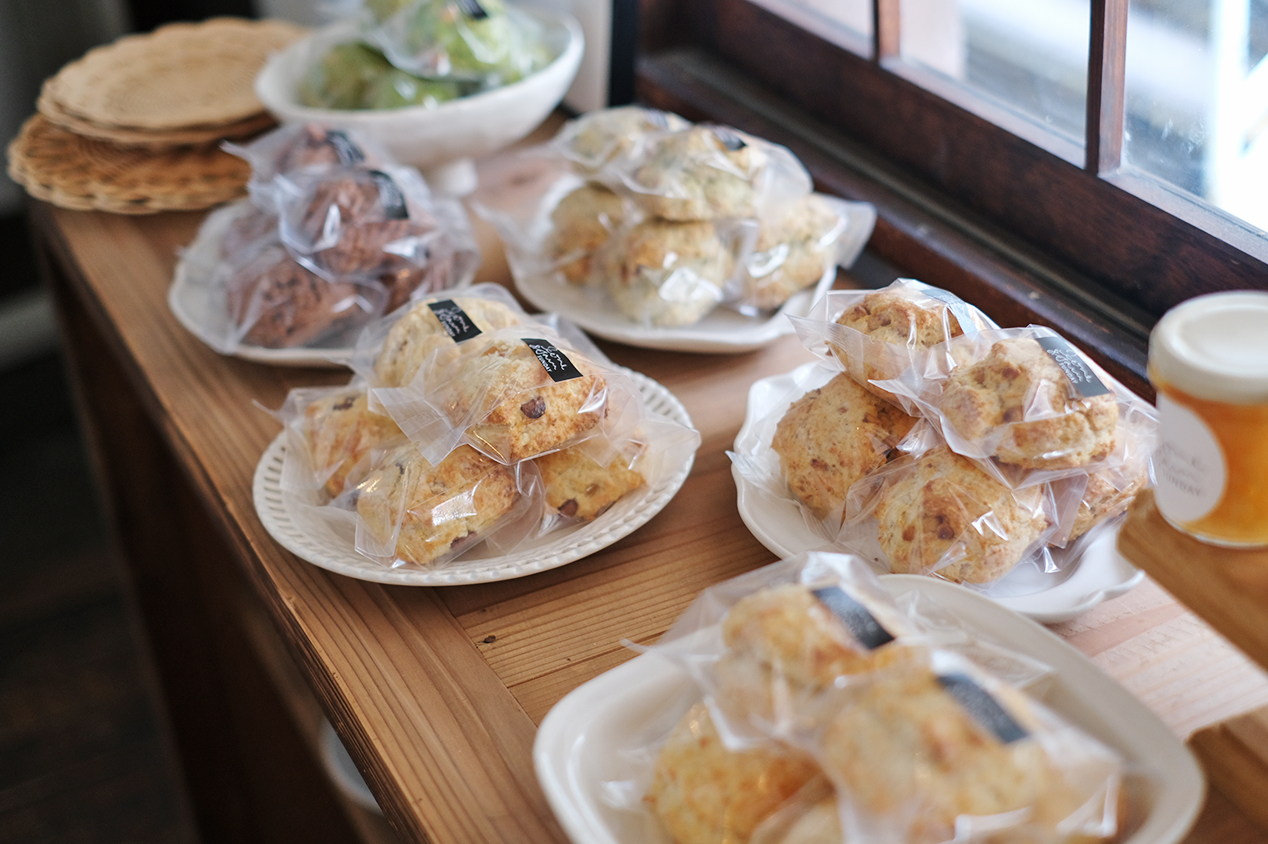 器好きの貞清さんが集めたお皿やカップで提供されることもイートインの楽しみのひとつ。居心地のいい空間でティータイムを楽しんだり、持ち帰っていろんな種類のスコーンを楽しんだり、どちらもおすすめのお店です。