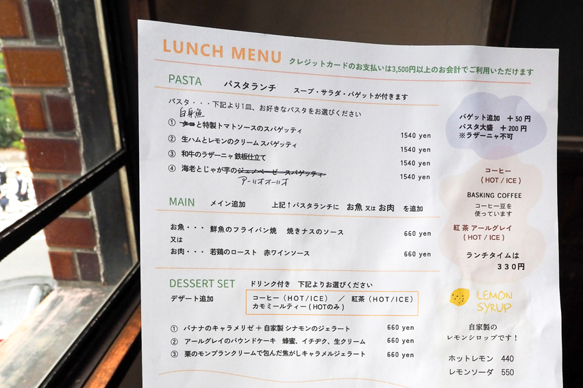 ランチタイムは平日、休日ともに開店から満席が続く人気ぶり。スープ、サラダ、バゲット付きの「パスタランチ」(1,540円)を基本とし、希望に応じてメイン料理やデザート(各+660円)、ドリンクを追加してコーススタイルで楽しむこともできます。※写真は2025年9月のメニュー