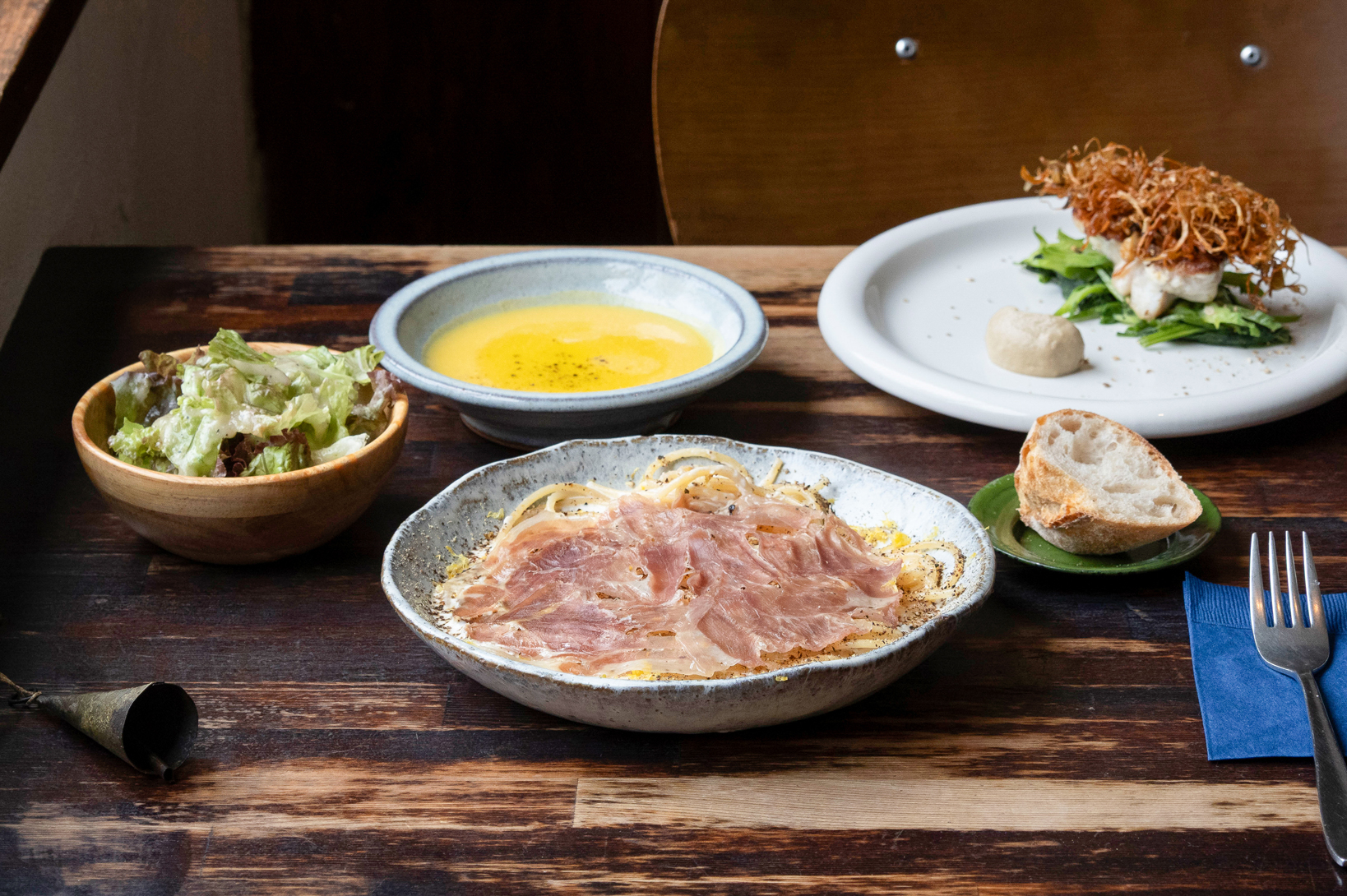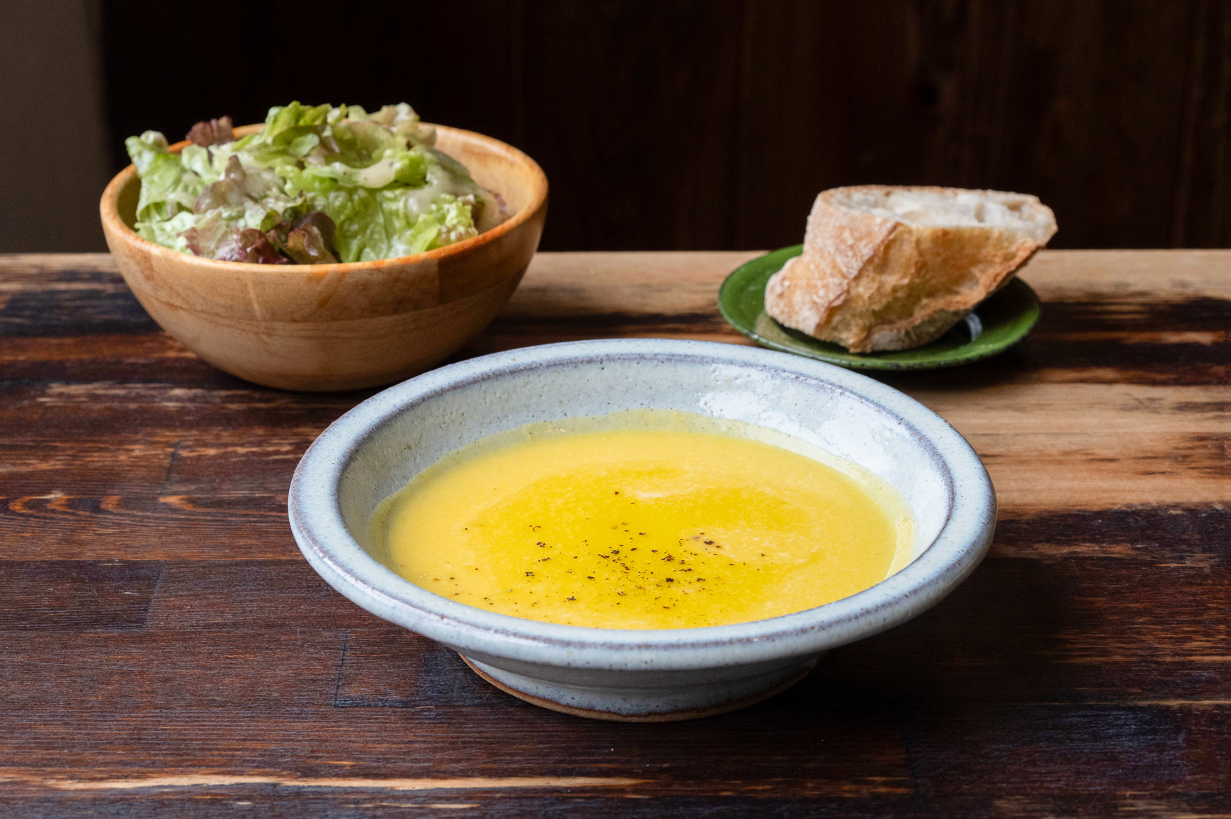 ランチのスープや季節のパスタ、メイン料理は仕入れ食材によって替わり、取材時には「カボチャの冷製スープ」が登場。材料は味付けは塩のみとごくシンプルながら、サラリと広がる夏カボチャの香りやタマネギの甘味がたまりません。