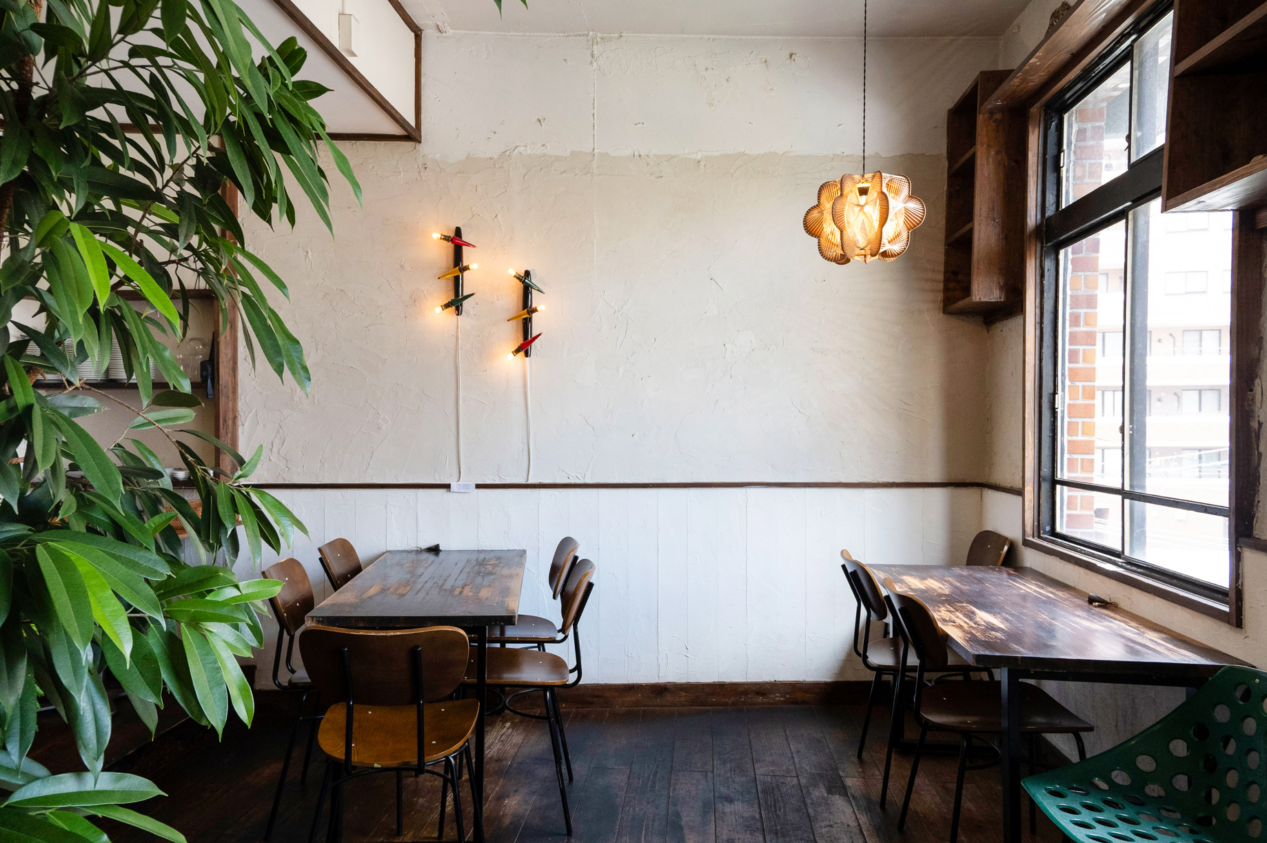 大工さんと一緒にオーナー自らリノベーションを手がけたという店内は、ゆったり落ち着いた雰囲気。漆喰の壁や木の風合いを活かした空間にヴィンテージの家具や照明がセンスよく配され、窓からは柔らかな陽の光が差し込みます。