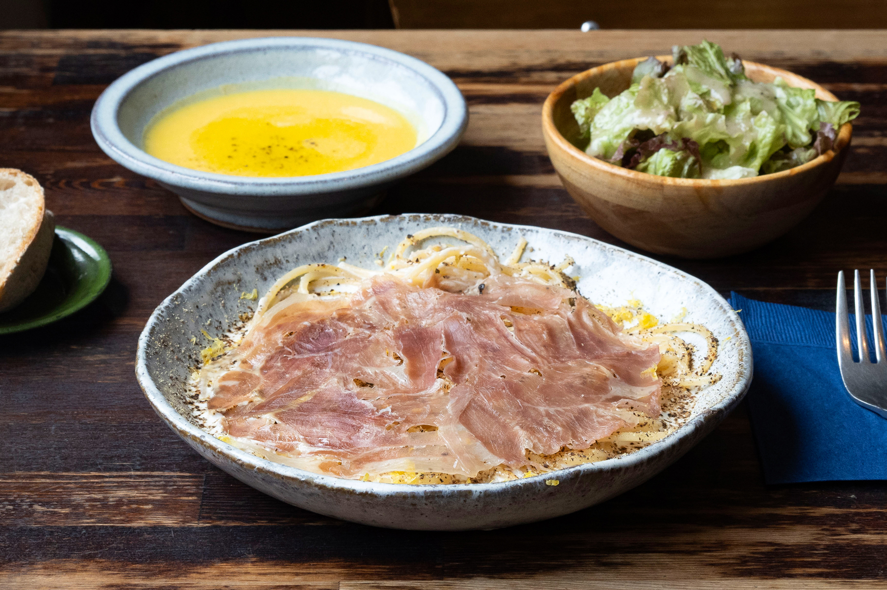 選べるパスタは定番と季節もの各2種類から選べ、今回は定番人気の「生ハムとレモンのクリームスパゲッティ」をいただきました。フランス産のプロシュート(生ハム)をパスタが見えないほどに盛り付けた逸品で、仕上げに削ったレモンピールの香りが爽やか!