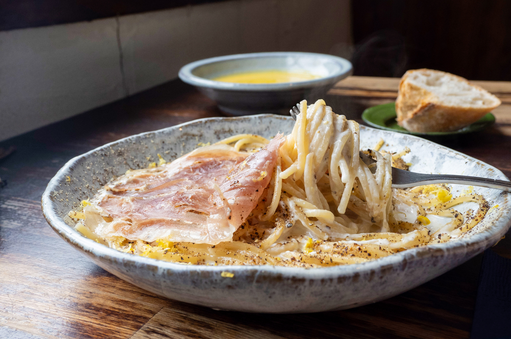 チーズとレモン果汁を加えたクリームソースがロングパスタによく絡み、たっぷりと削られた胡椒と生ハムの塩気が食欲をそそります。長時間発酵によって小麦の豊かな風味を引き出している人気ベーカリー「パンストック」のバゲットにソースをつけて食べるのもおすすめです。