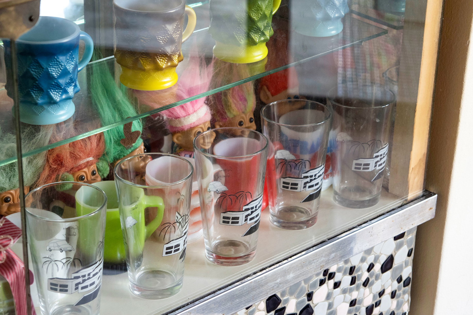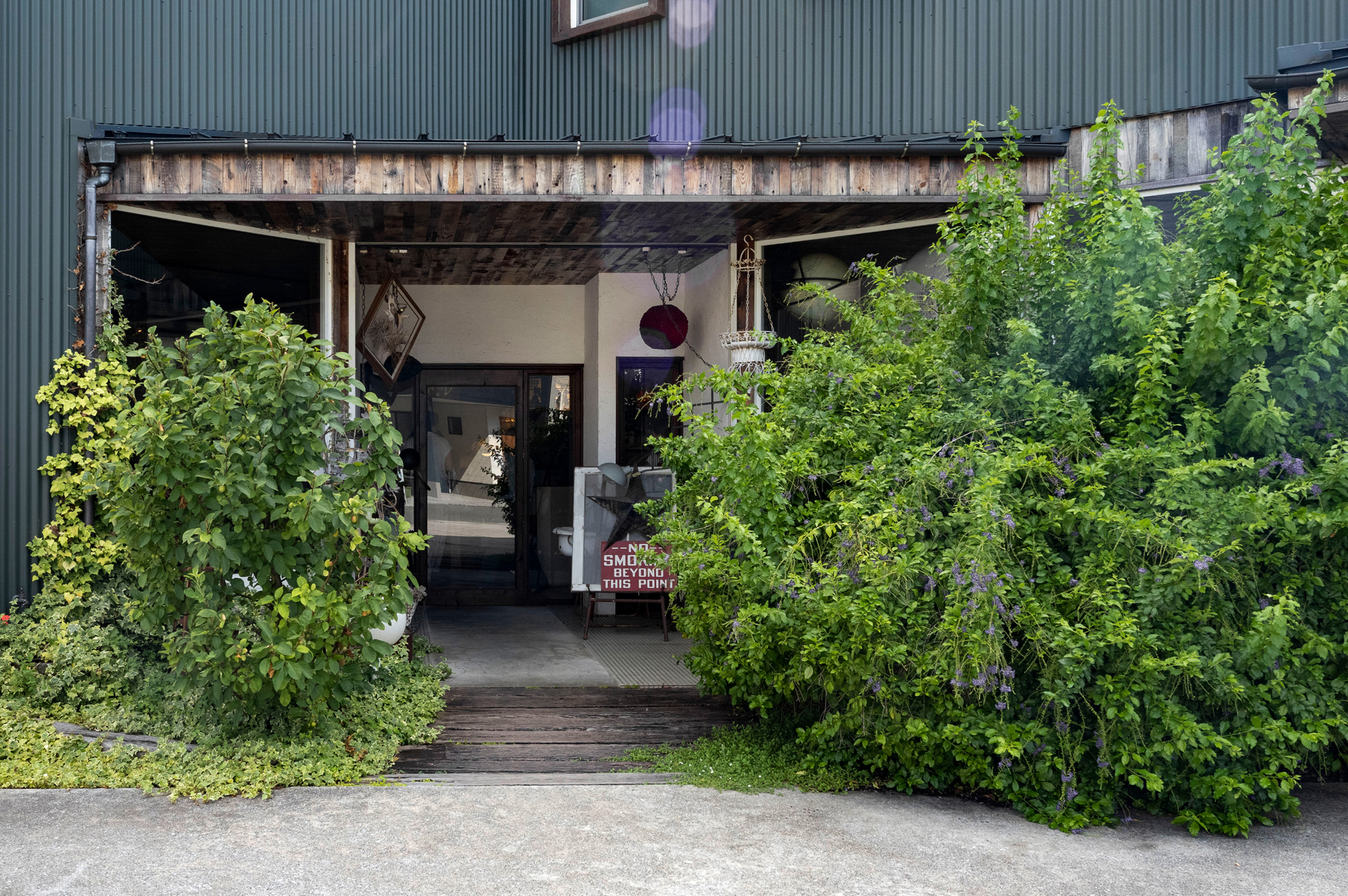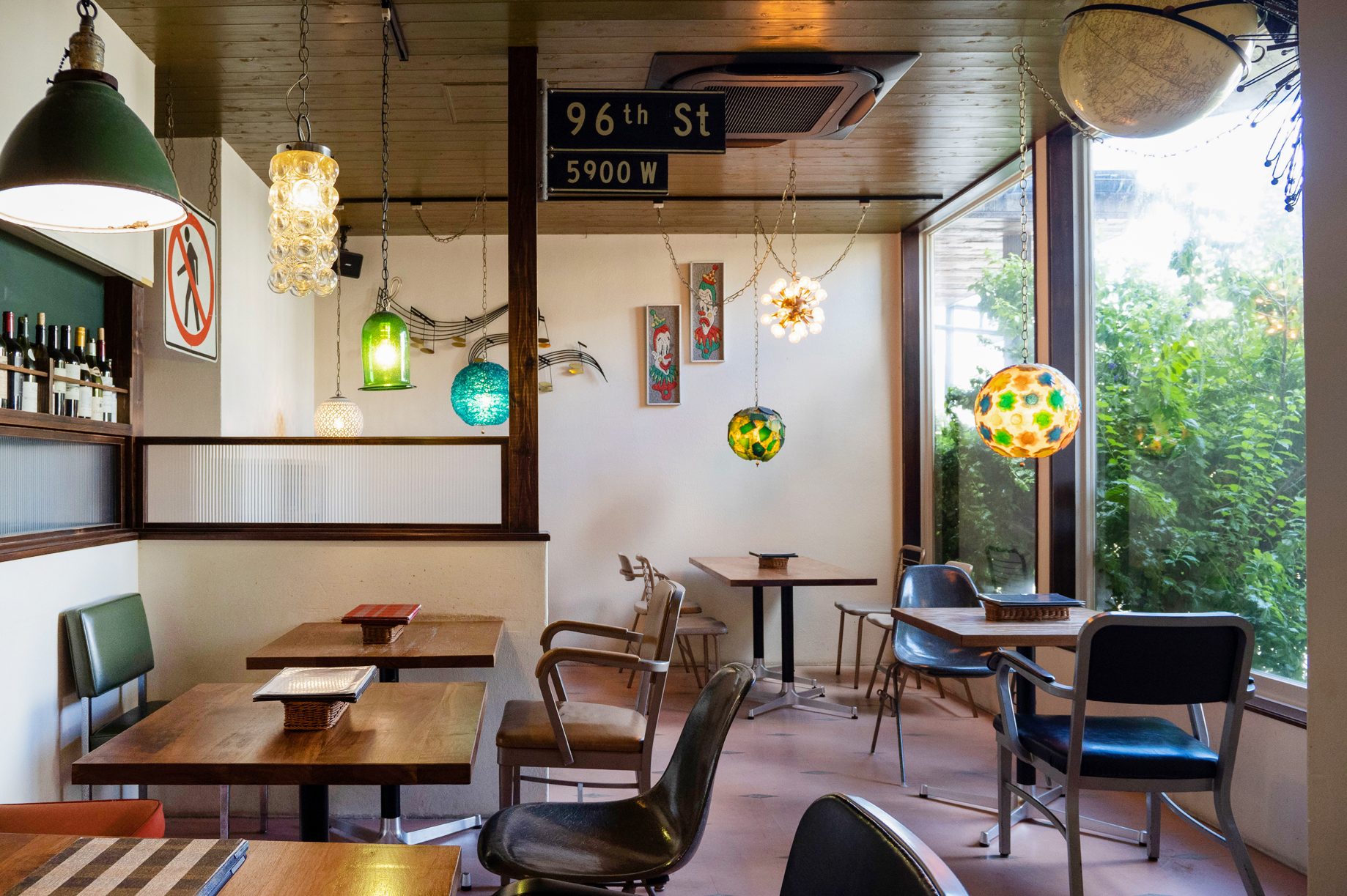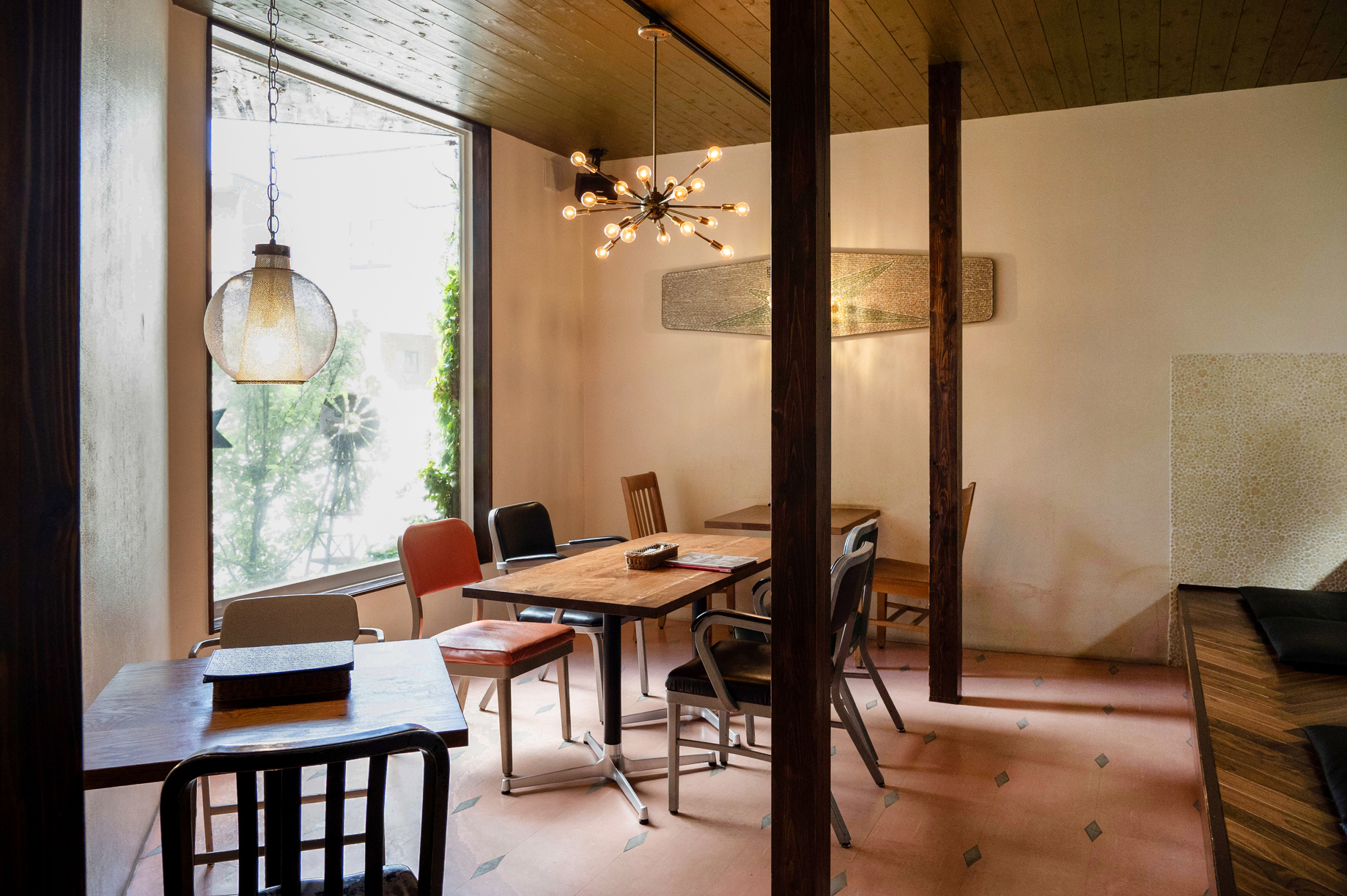 “フライパンのドアノブ”が印象的な扉を開いた先には、アメリカのヴィンテージ家具やミッドセンチュリ ーな照明を配した、おしゃれで遊び心ある空間が広がっています。