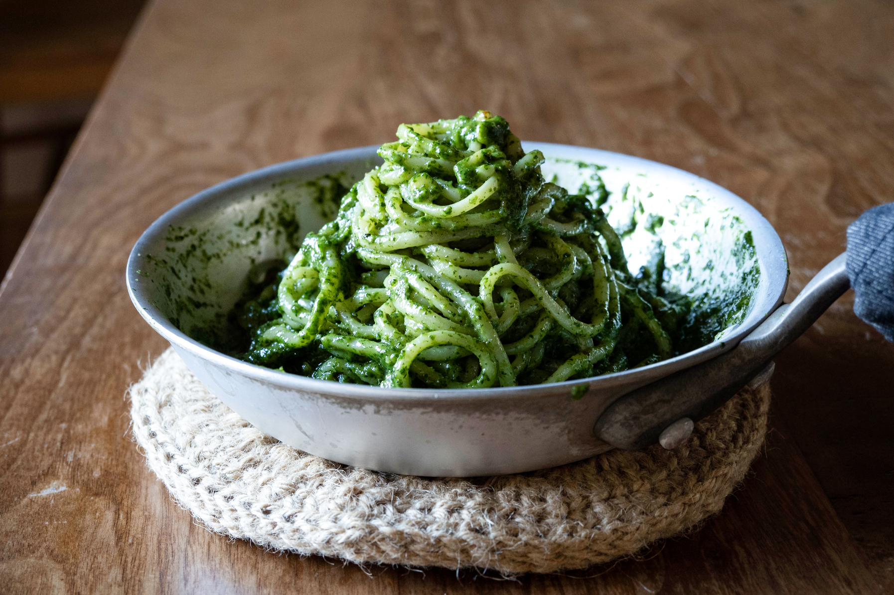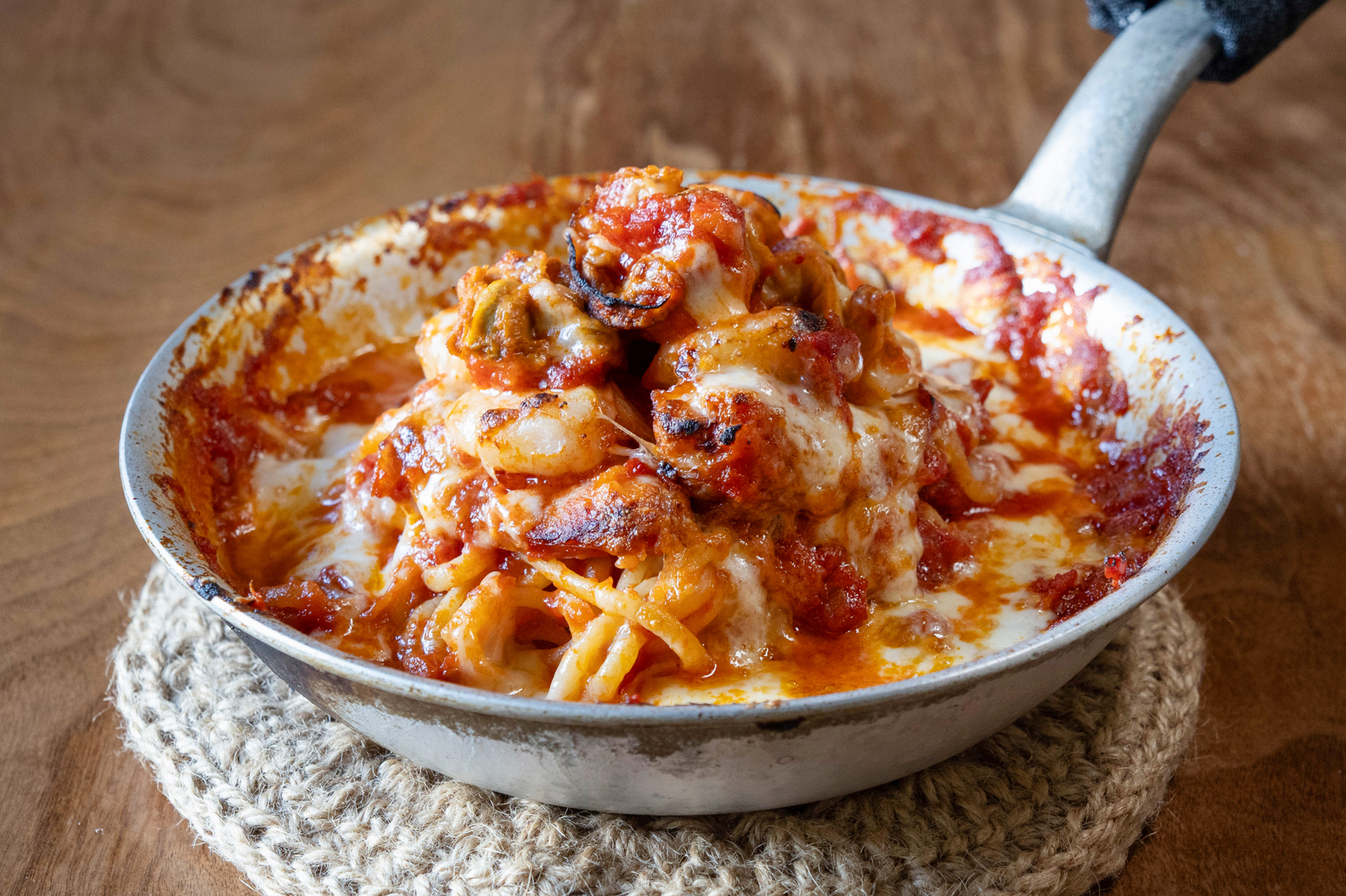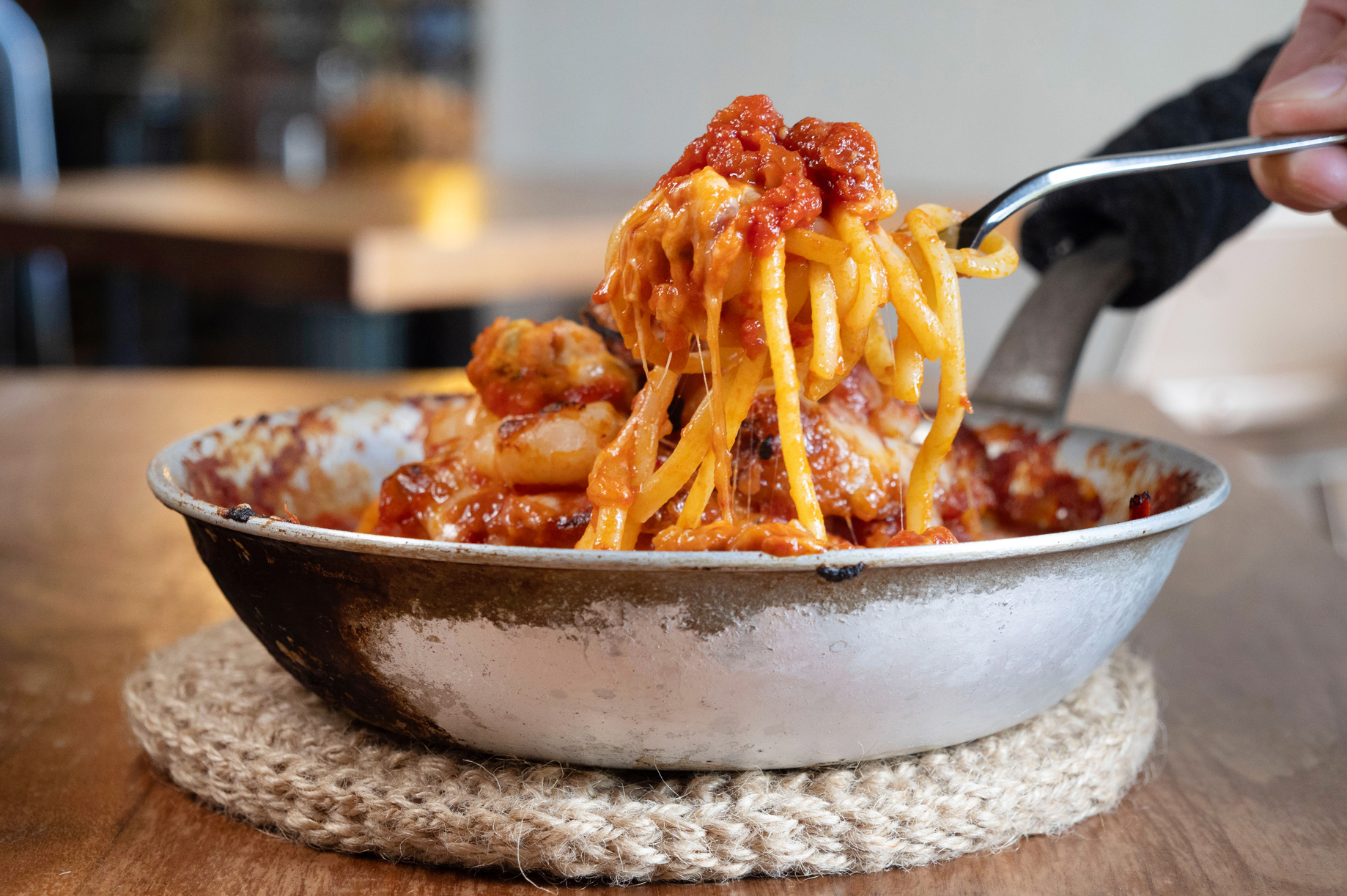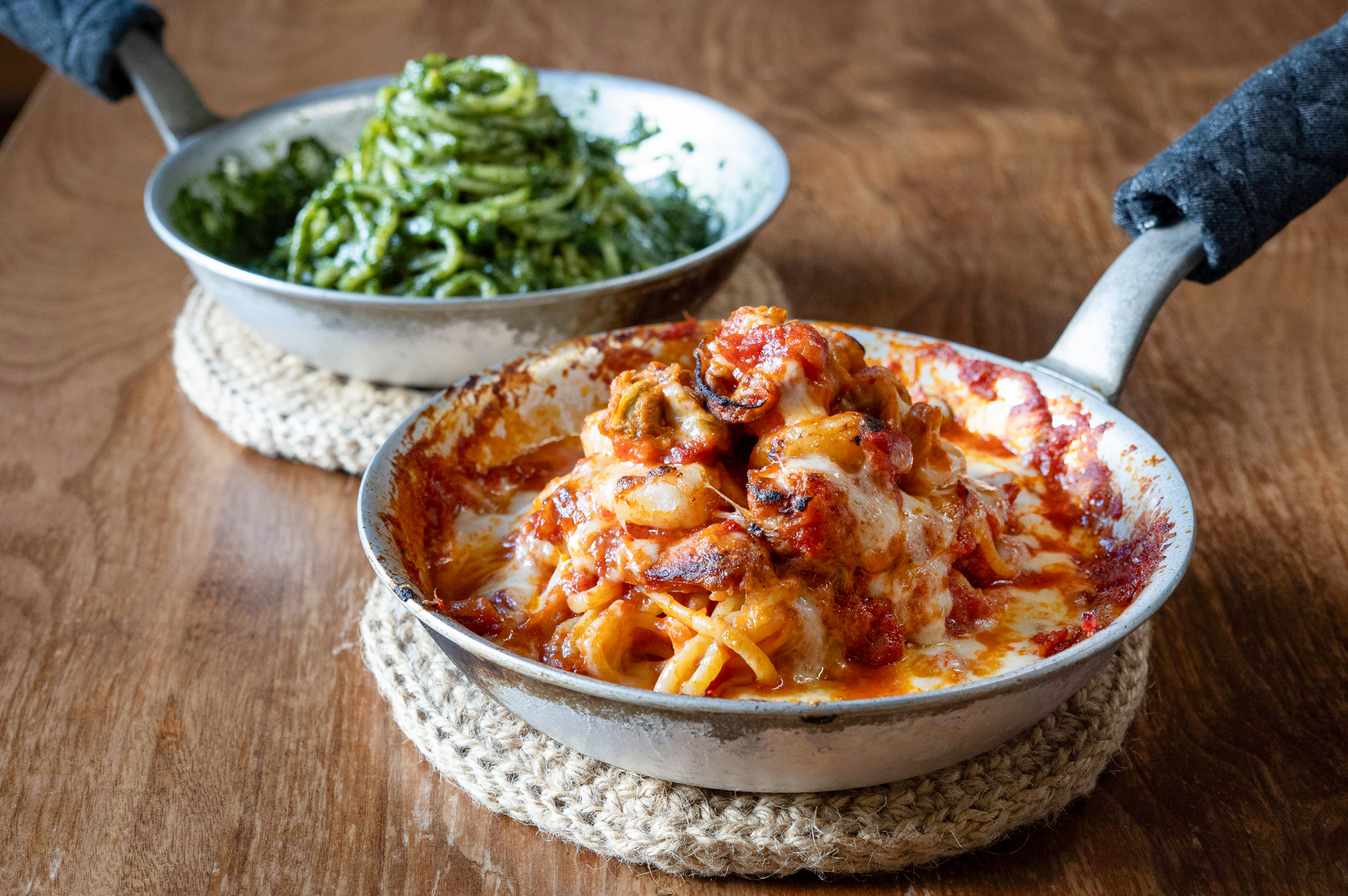 材料は小麦粉1種類と水のみで、混ぜものや添加物は一切不使用。8〜9時間かけて成形し、その後10日間以上熟成してようやく完成するそうです。取材時には2種類のパスタをオーダーしました。熱々のフライパンごと提供するのが「La Festa」流で、立ち上る香りがたまりません。