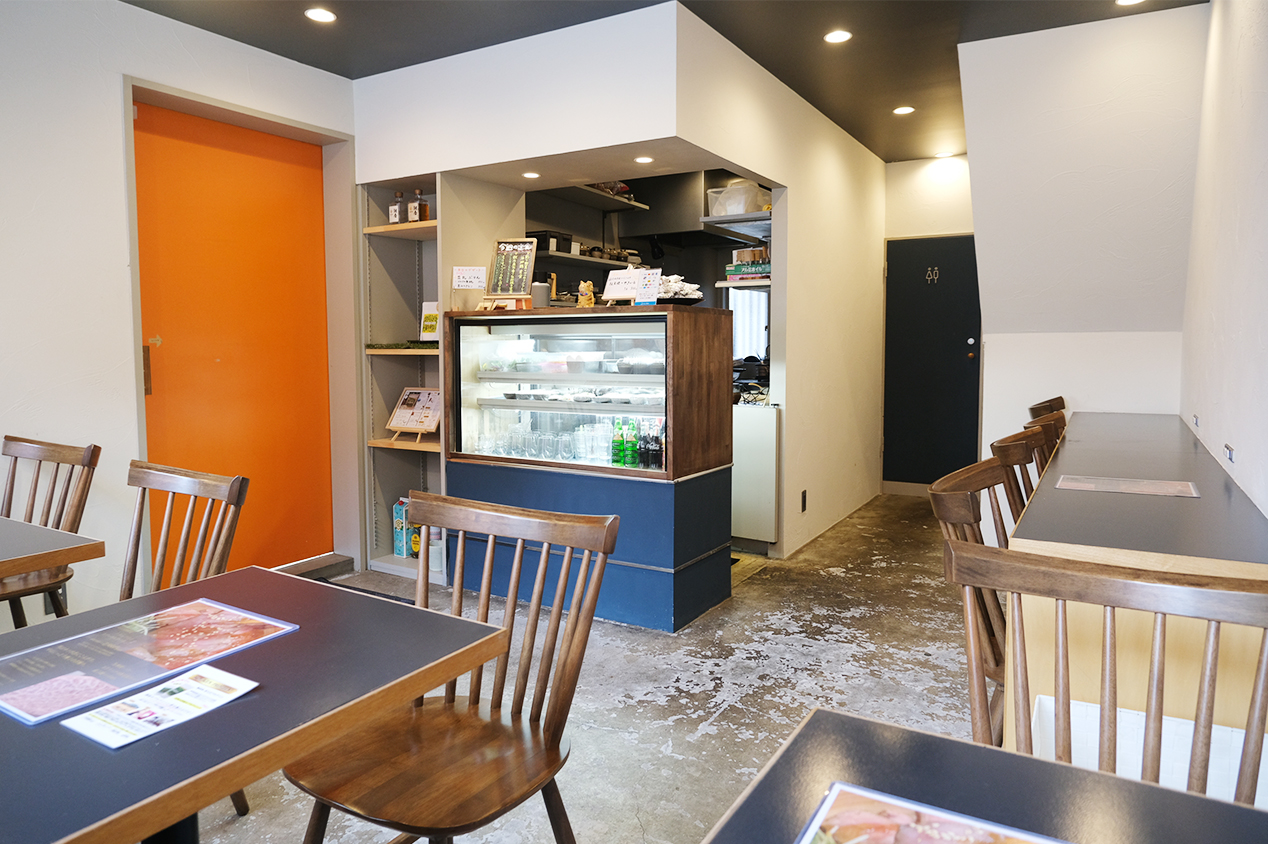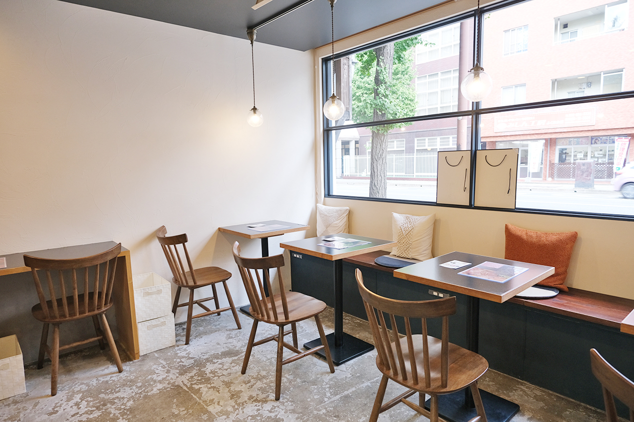 カフェのようにおしゃれな内装の店内。カウンター席とテーブル席があり、ひとりでも複数人でも利用しやすい雰囲気です。