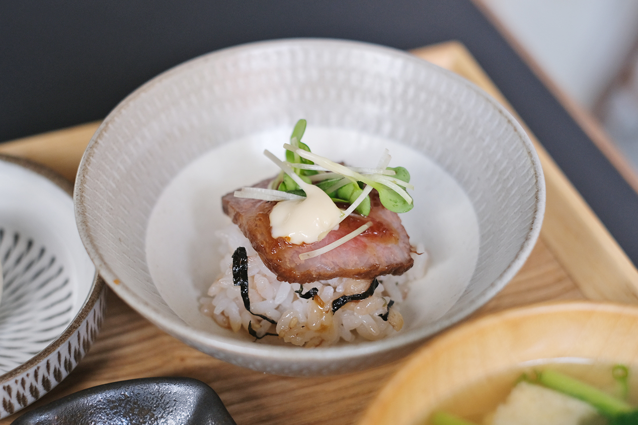 ごはんの上にたっぷりとのっている自家製ローストビーフはA5ランクの九州産黒毛和牛を低温調理したもの。A5ランクのなかでも格付けの高いものを選んで仕入れているそうです。まずはそのまま食べるとしっとりと柔らかなローストビーフはとろけるような至福の味わいが口いっぱいに広がります。刻んだトリュフを加えた醤油ベースのソースも高級感があり、まさに“ごほうび定食”と呼ぶのにぴったりです。