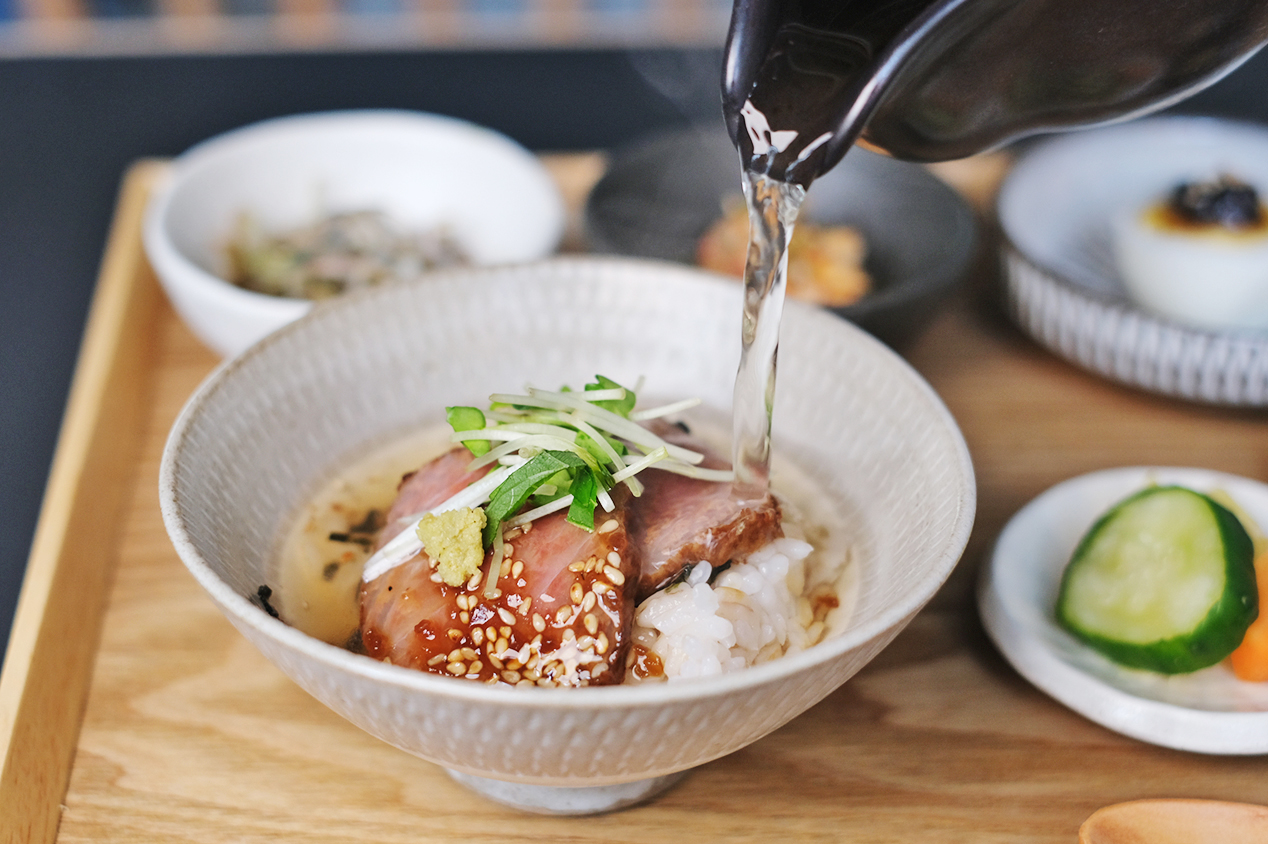 最後は、カツオ節と昆布で毎日取る出汁をかけてお茶漬けに。そのままでもうま味たっぷりのローストビーフに出汁のうま味が加わり、おいしさは最高潮。するするっと胃に収まるさっぱりとした味わいで締められるのもいいですね。