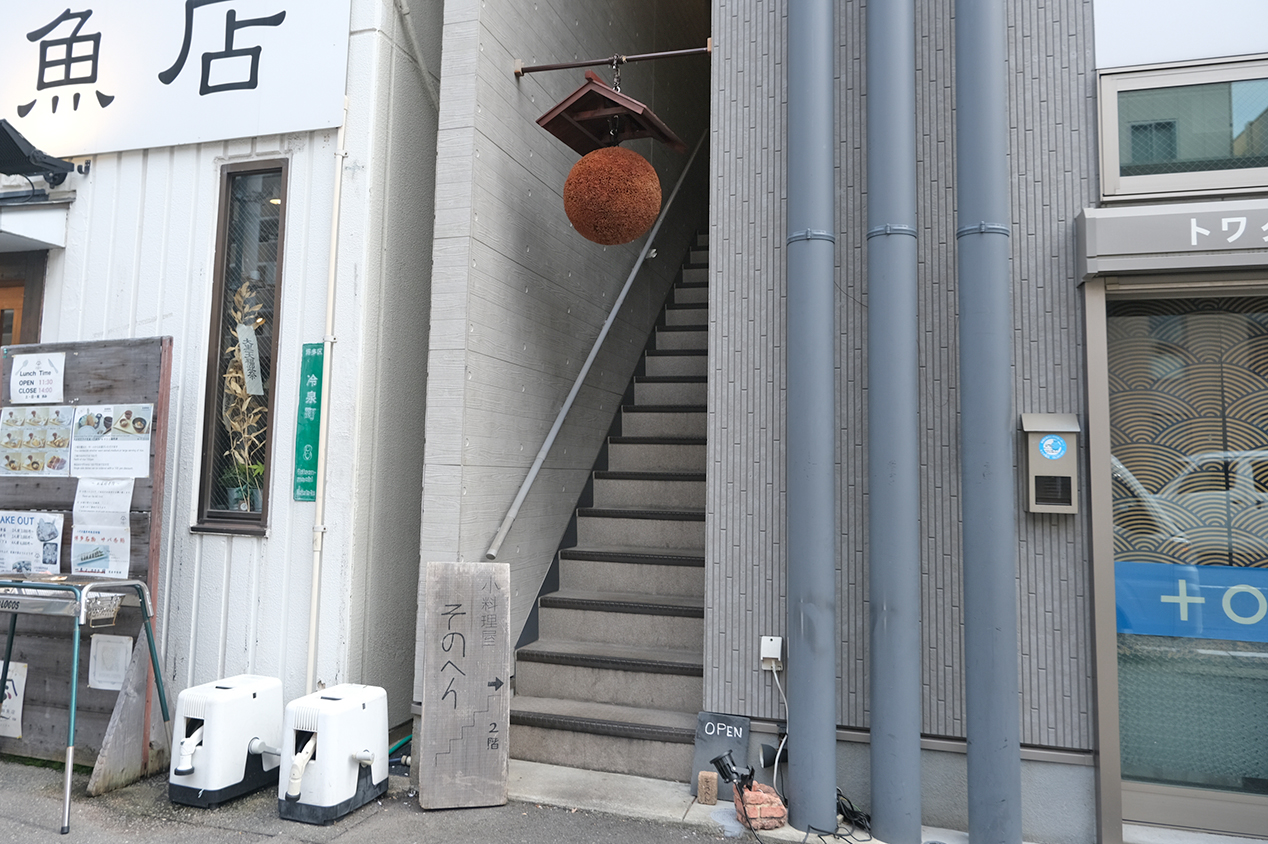 店舗は建物の2階にあり、注意していないと見逃しそうな細い階段を上った先にあります。
