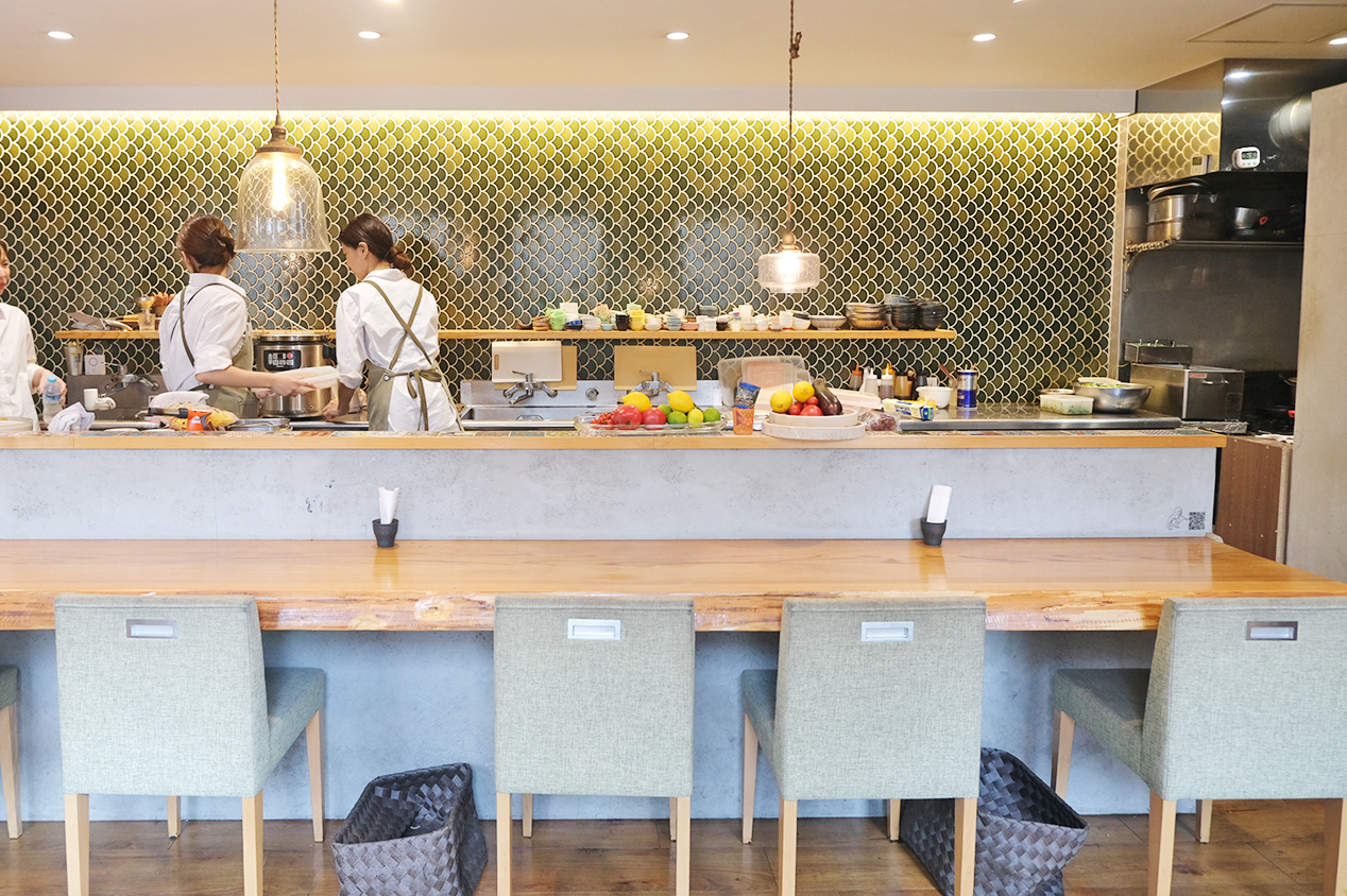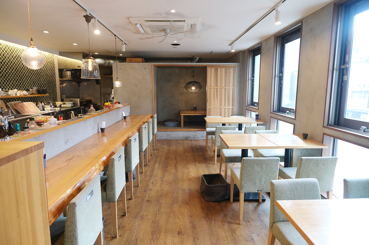 店内は明るい和モダンな雰囲気。テーブル席とカウンター席、そして座敷タイプの個室が備えられています。