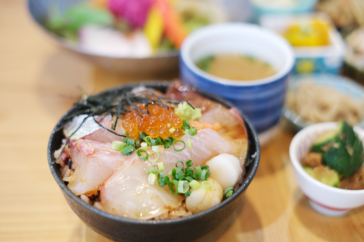 自家製のローストビーフ丼にも惹かれますが、今回は海鮮丼を注文しました。魚は、オーナーが早朝から長浜市場で仕入れを行っているので鮮度抜群。仕入れによって内容が替わり、この日はタイやシマアジ、スズキなどが贅沢に盛られた上に、イクラと明太子がトッピングされていました。お茶碗サイズですが、見た目以上にボリュームがあります。