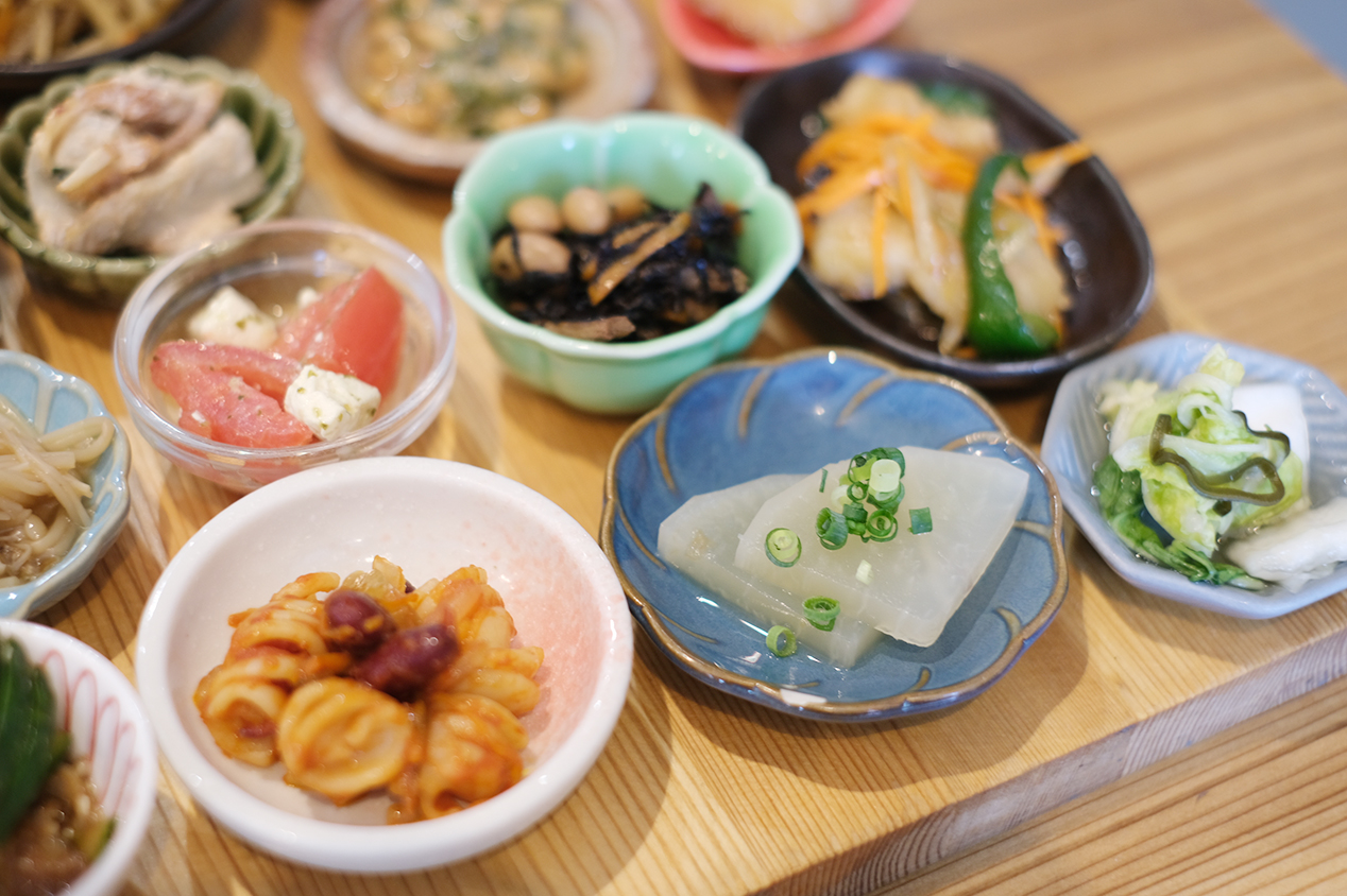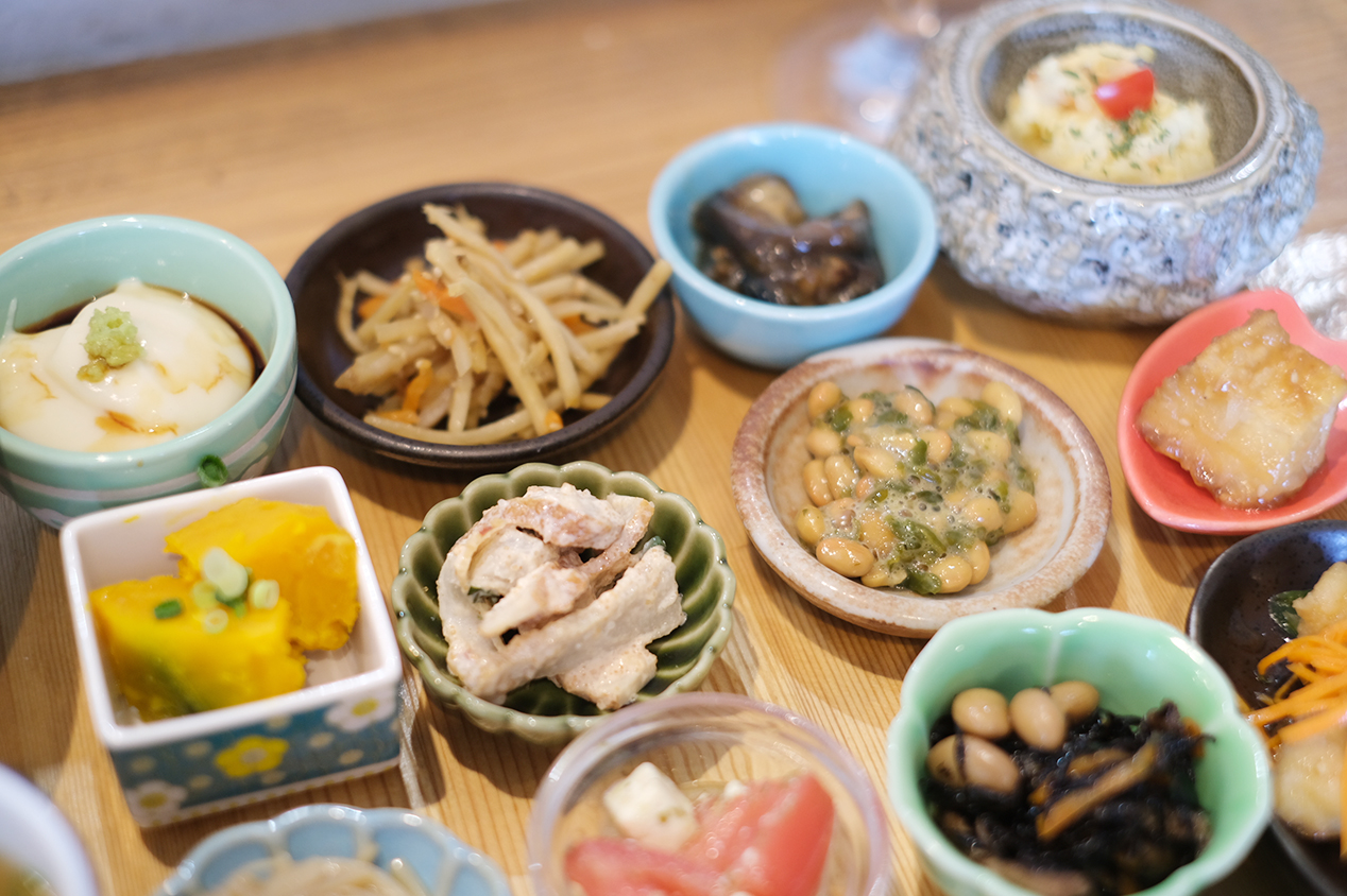 ずらりと並んだ16種類の小鉢は、揚げ出し豆腐やポテトサラダ、野菜の煮物、トマトマリネなど和洋織り交ぜた内容で、どれも丁寧に手作りされていることがわかるおいしさ。野菜を中心にさまざまな食材がバランスよく取り入れられていて満足度も満点です。