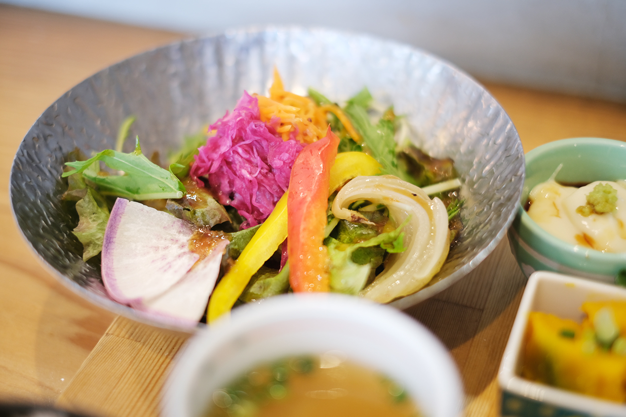 彩りのいいサラダはクミンがアクセントになったキャロットラペや紫キャベツのマリネなどひと手間加えられているのがうれしいですね。野菜は糸島産や朝倉産のものを中心に使用しているそうです。