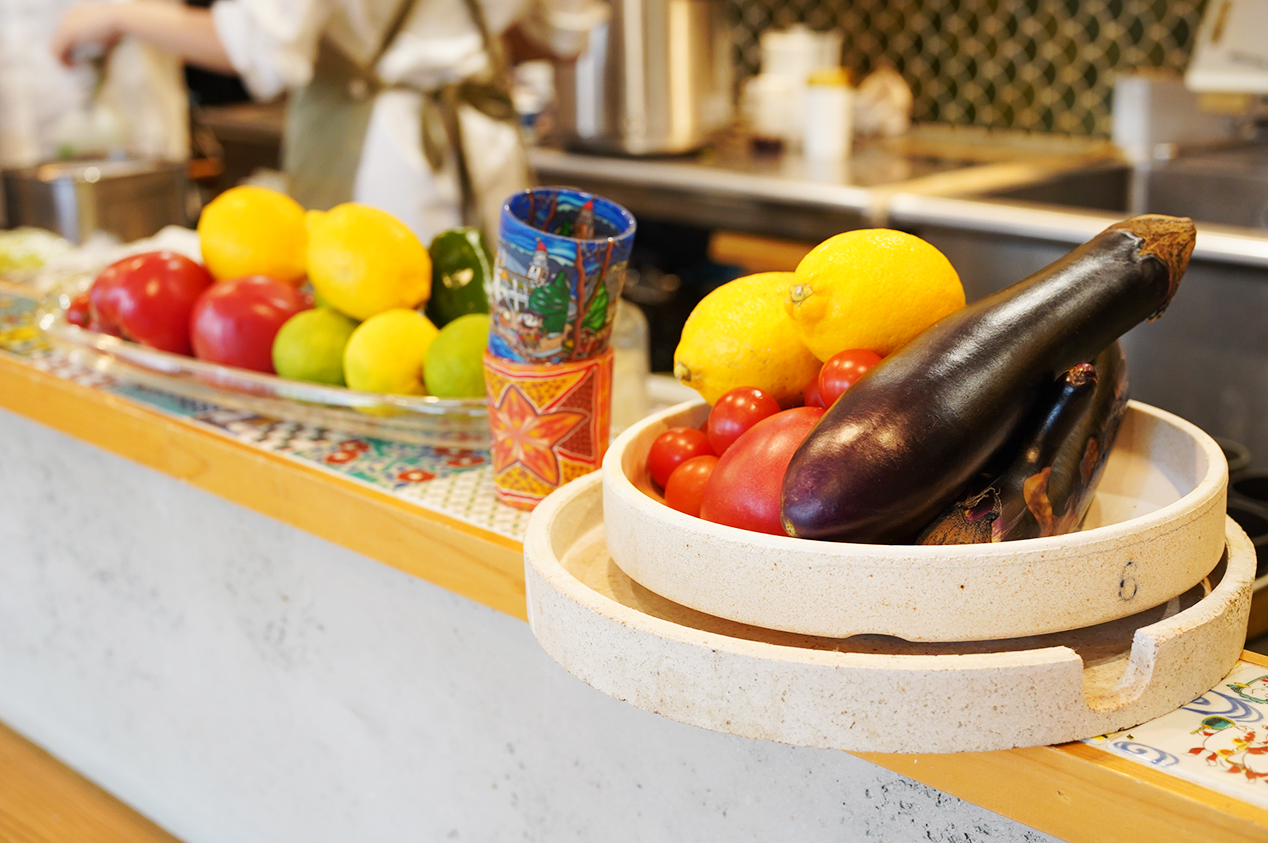 杉の一枚板を使ったカウンターや鱗模様の壁、カウンターにあしらった九谷焼のタイルなど内装の随所にこだわりが感じられます。