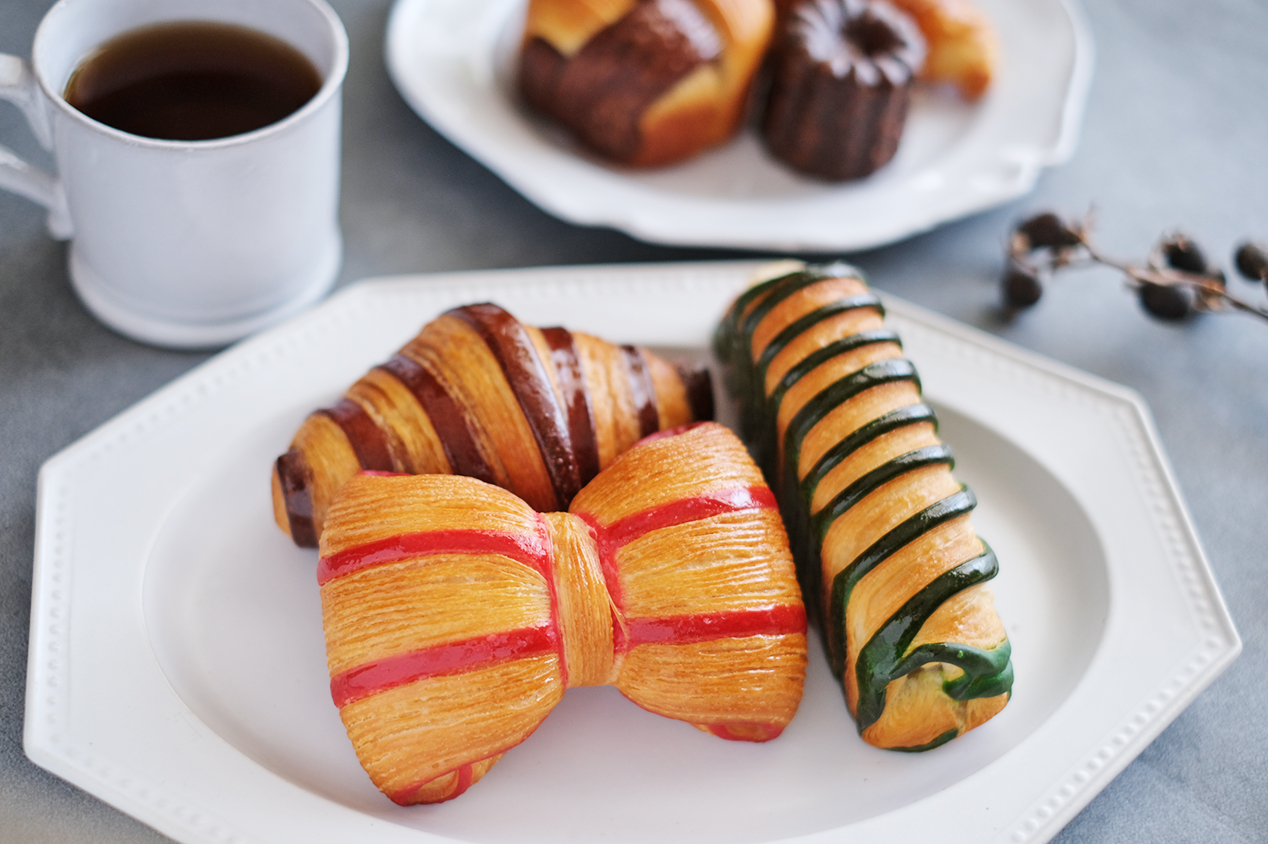 手前から時計回りに「リボンクロワッサン」(410円)、「ショコラティン」(340円)、「抹茶のクロワッサン」(432円)。二層仕立てのクロワッサンは食べるのがもったいないほど見た目も美しく華やかです。
