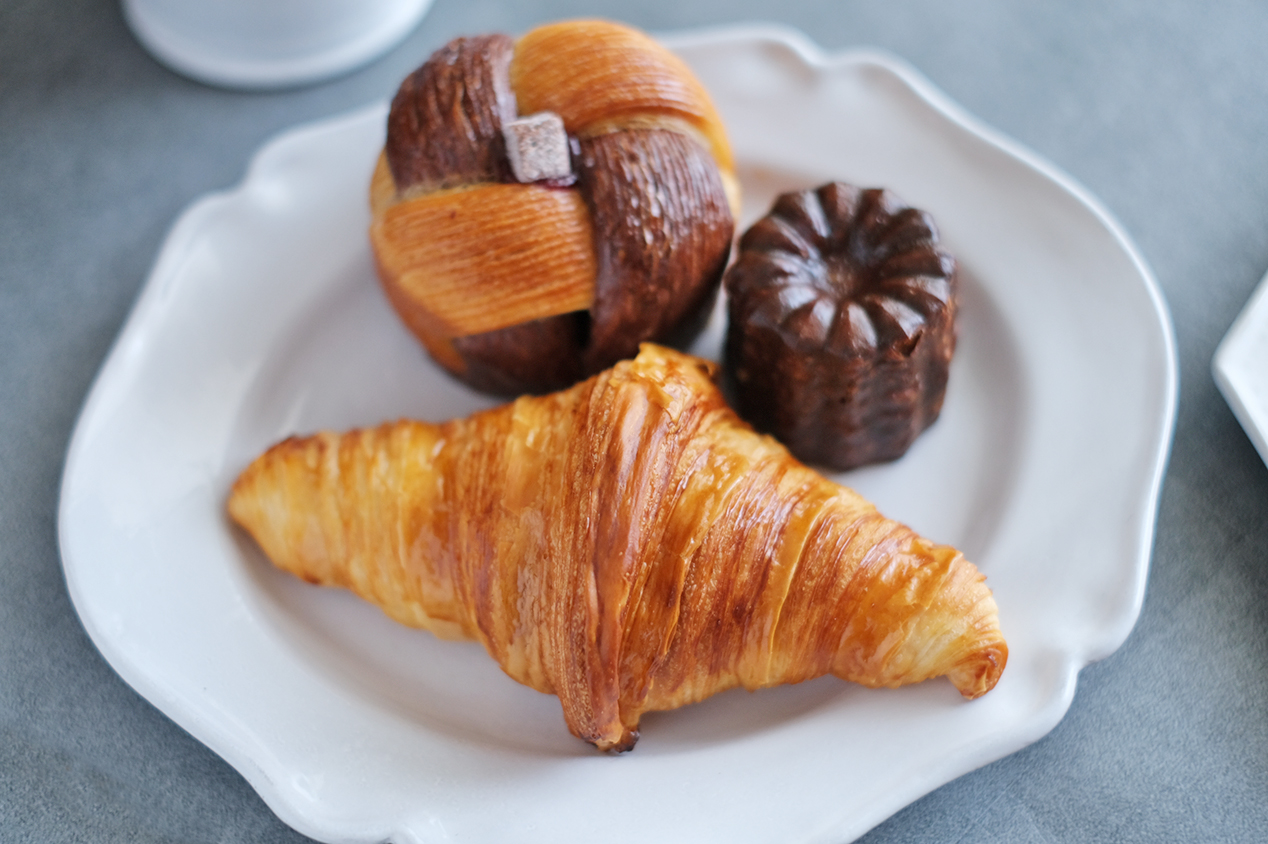 手前から時計回りに「クロワッサン」(286円)、「ガトーショコラッサン」(500円 ※期間限定商品)、「カヌレ」(286円)。堀さんのクロワッサンは、パティシエとして身に付けた技術を活かした独自のレシピでつくられ、5日間の仕込みを経て完成します。「最初は3日間だったのですが、熟成時間などをいろいろ試した結果、5日間かけたものがベストな状態に仕上がったんです」という堀さん。その言葉から手間をかけてもおいしさを追求する姿勢が伝わってきます。