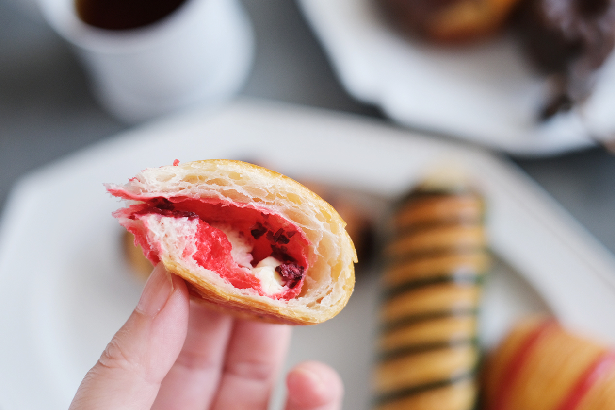 「リボンクロワッサン」の中にはドライラズベリーとホワイトチョコ、「ショコラティン」にはしっとりとしたチョコレート、「抹茶のクロワッサン」には八女抹茶の餡と求肥、ホワイトチョコが入っていておいしさもさらにグレードアップしています。