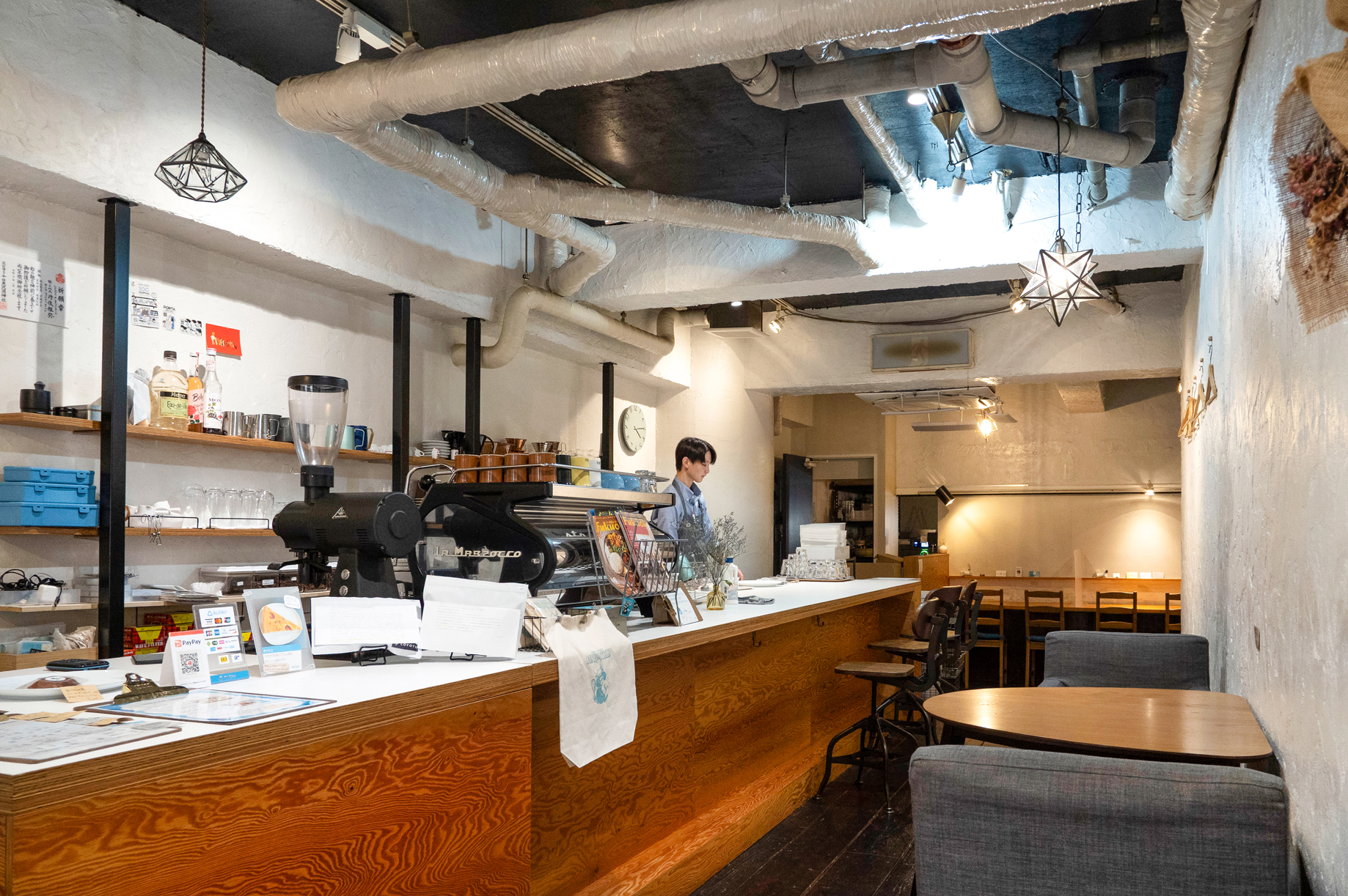奥はカウンター席とテーブル席を備えるカフェスペース。こちらでは、購入したケーキや自家焙煎コーヒーをはじめとしたドリンクに加え、デザートプレートやカレー、オムライスなどのランチメニューを味わえます。