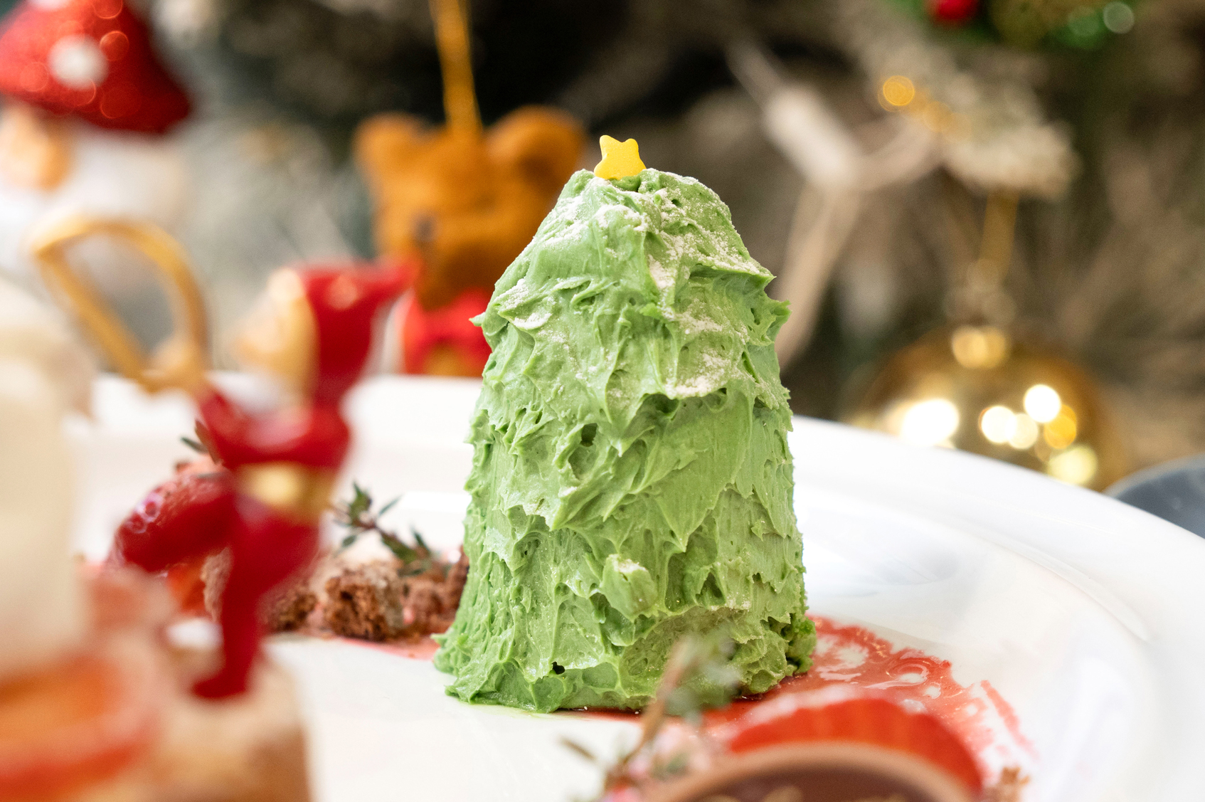 右奥にはクリスマスツリーをイメージした可愛らしいケーキも。爽やかな青リンゴとバニラのムースを抹茶のバタークリームでコーティングしてあり、滑らかな口当たりがたまりません。