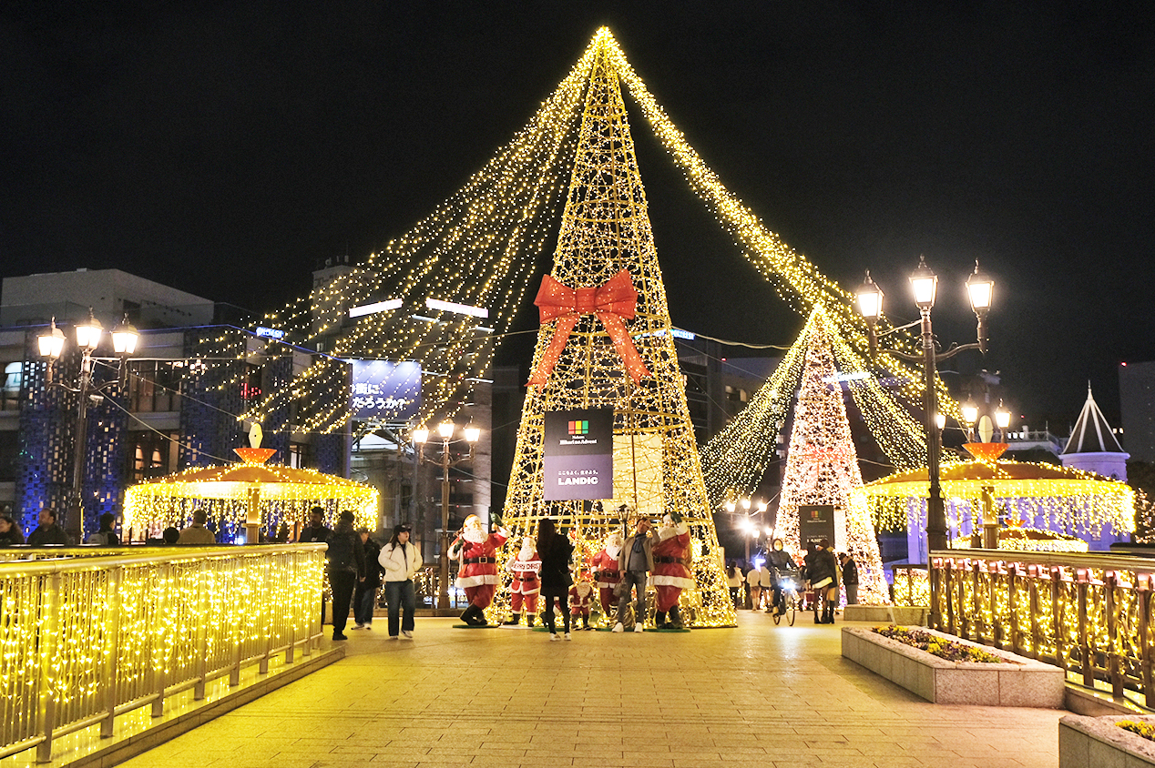 「福博であい橋」には大きな赤いリボンがきらめくシャンパンゴールドのツインタワーが登場。橋全体がまばゆい光で彩られます。中洲中央通りや明治通りの街路樹にもイルミネーションが灯り、中洲の夜に華やぎを添えています。