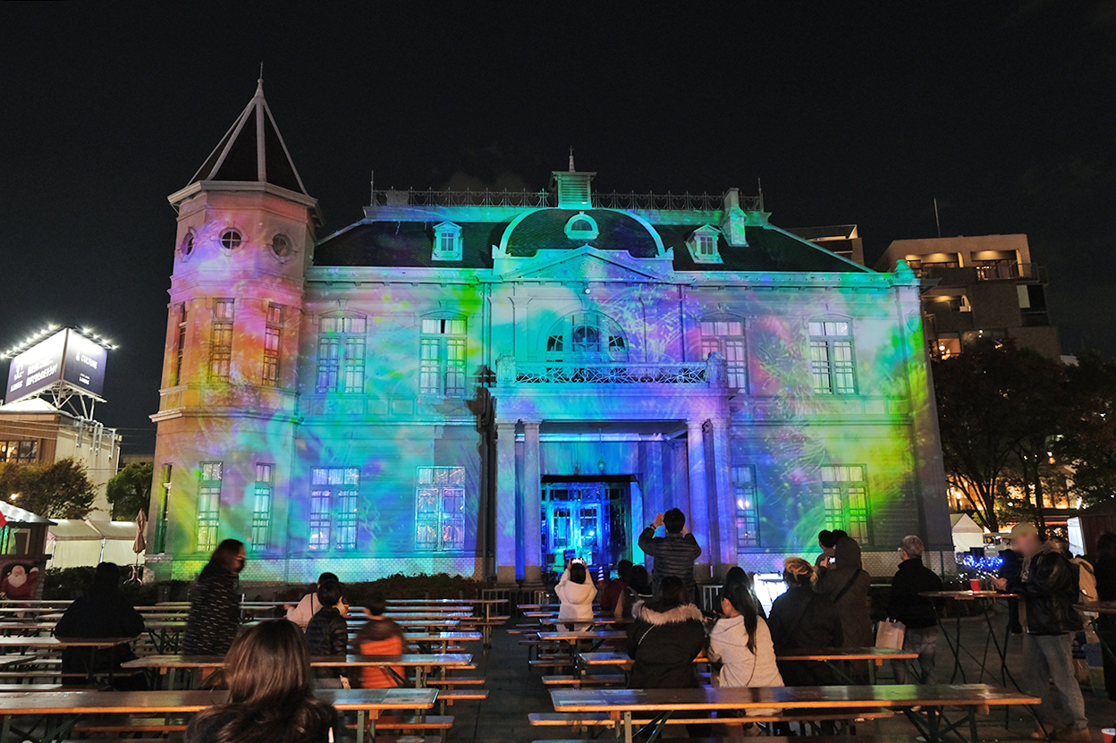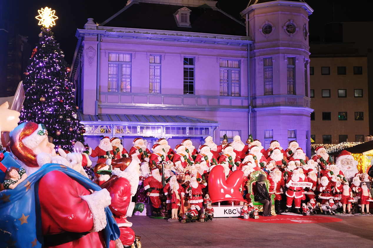 ライトアップされた「旧福岡県公会堂貴賓館」前にはサンタクロースのオブジェが大集合。今年はさらに数が増え、約130体の個性的なサンタクロースが出迎えてくれます。さらに「旧福岡県公会堂貴賓館」を舞台にしたプロジェクションマッピングも初登場。「LOVE クリスマス」をテーマに、さまざまな映像がが音楽と共に映し出されます。また、ステージで行われるライブなどを見ながらクリスマスグルメも楽しめます。