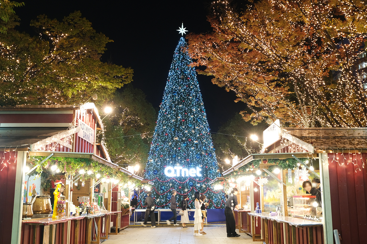 大きなブルーのツリーが立ち、360度を囲むルミネーションがキラキラと輝く「大名ガーデンシティ」の芝生広場。昨年より3店舗増えた全18店舗のヒュッテでは、ホットワインやホットチョコレート、チーズフォンデュなどのグルメやクリスマス雑貨などを販売しています。広々とした会場でゆっくりとクリスマスグルメを楽しんでみてはいかがでしょうか。