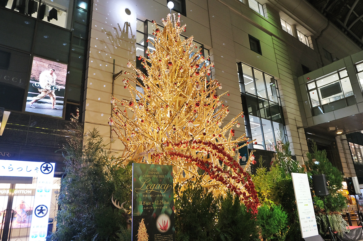 毎年、環境をテーマにしたツリーが立つ「大丸福岡天神店」のパサージュ広場。今年は、森林を整えた際の間伐材を使い、赤い折り鶴やオーナメントを付けた高さ約10mのツリーが登場しています。ツリーのそばにはクリスマスマーケットが立ち、飲食を楽しむことができます。