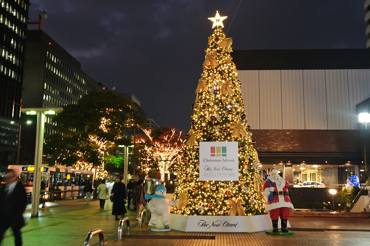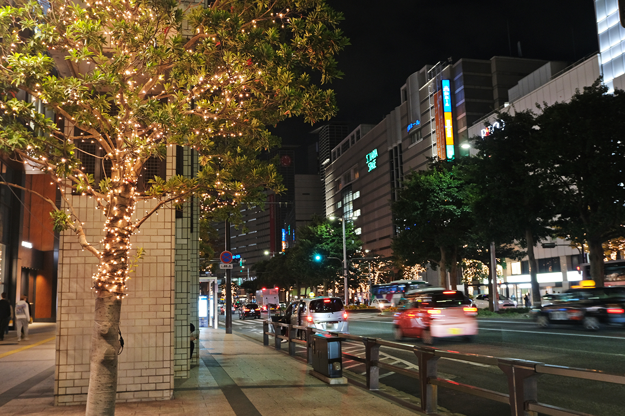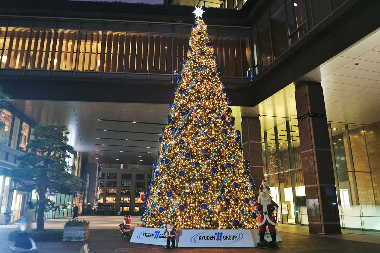 渡辺通1丁目交差点から天神交差点の間の街路樹に灯りがともり、通りが優しい光に包まれます。今年から新たに、渡辺通1丁目交差点そばの「ホテルニューオータニ」と「九州電力 電気ビル共創館」前に大きなツリーが登場し道行く人を楽しませています。