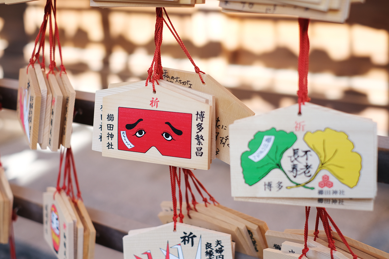 絵馬の図案は複数あり、博多を代表する民俗芸能「博多にわか」のお面やイチョウ、だるまなどをモチーフにしたものが用意されています。
