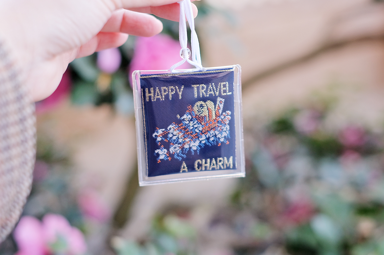 「博多祇園山笠」をモチーフにした旅行の御守り(1,000円)も櫛田神社ならでは。紺のほかに朱色もあります。