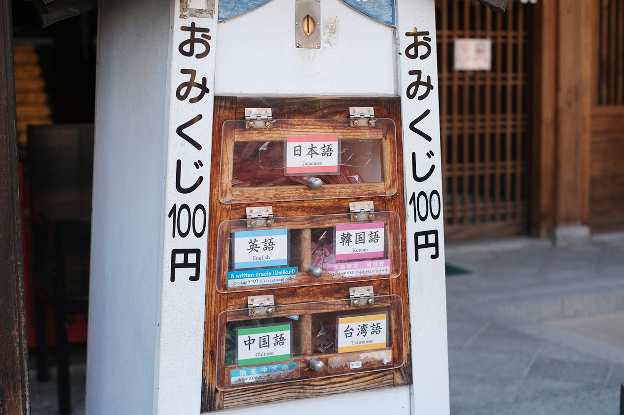 国際色豊かな参拝者に合わせておみくじも5ヵ国語に対応。取材時も海外からの旅行者の方がおみくじを楽しそうに引いていました。
