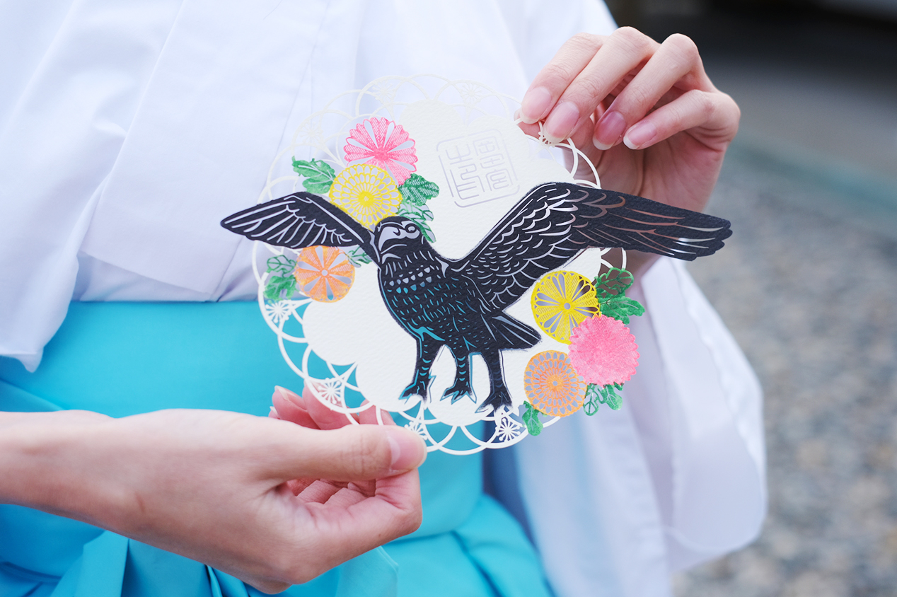 境内の像をモチーフにした切り絵御朱印「やたがらす像」(2,000円)は通年受けることができるもの。一つひとつ職員さんが色づけしているそうです。