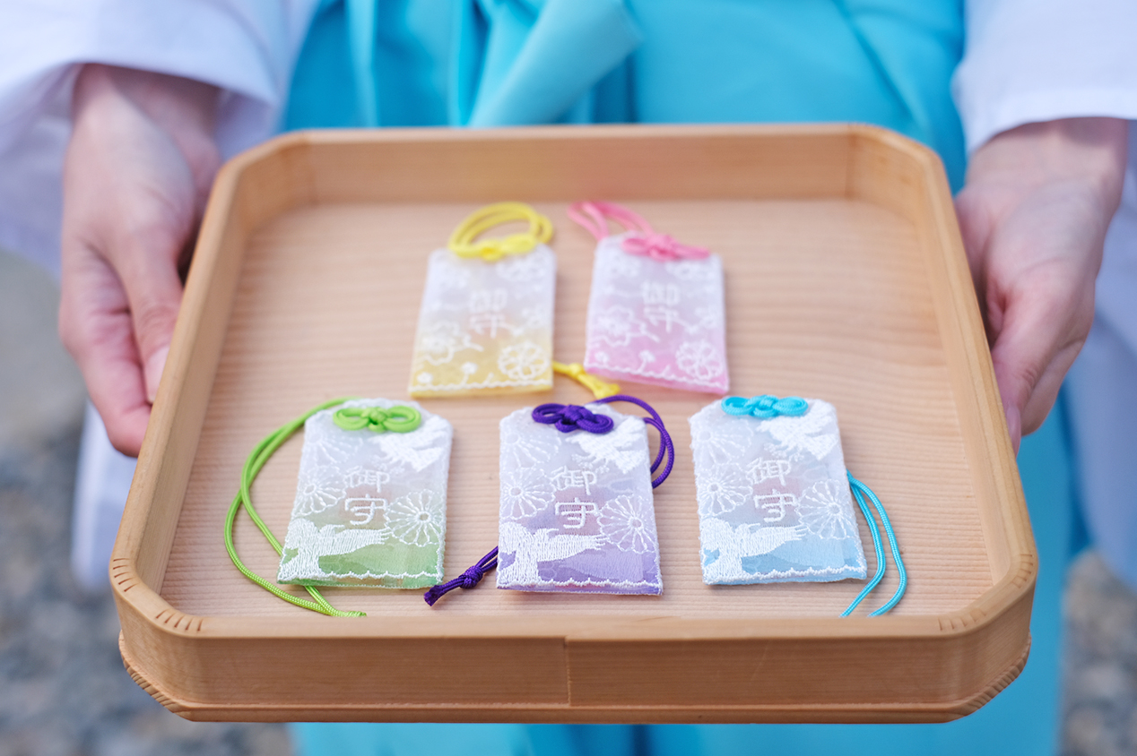 御守りやおみくじも可愛らしいものが用意されています。「レース御守」(各1,000円)には、八咫烏・金鵄・社紋の菊柄(緑色・紫色・水色)と桜レース(黄色・桃色)があり、中にはアクリルのお札が入っています。水色は2026年のお正月から頒布が始まった新しいものです。