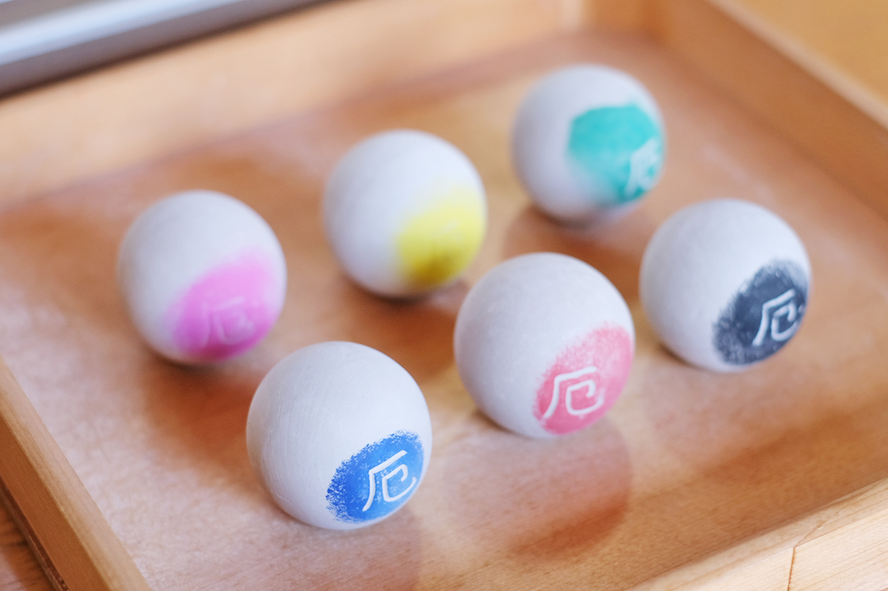 「厄除け玉」(2個500円)は、青…仕事運、緑…健康運、桃…恋愛運などの6種類があります。