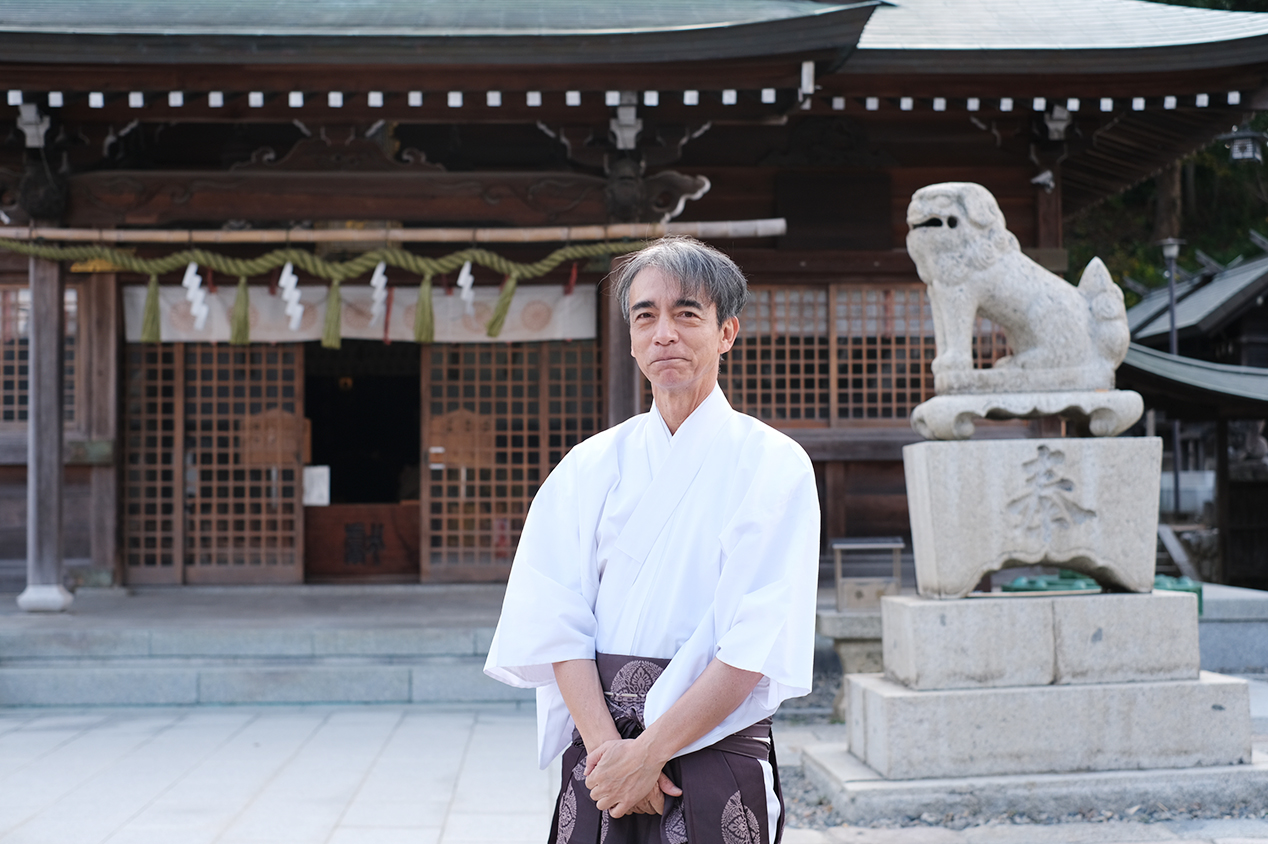 40年以上にわたり、宮司として「岡田宮」を守る波多野直之さん。「ご参拝くださる方々に寄り添い、笑顔になっていただけるような神社をめざしています。ぜひごゆっくりお参りください」。
