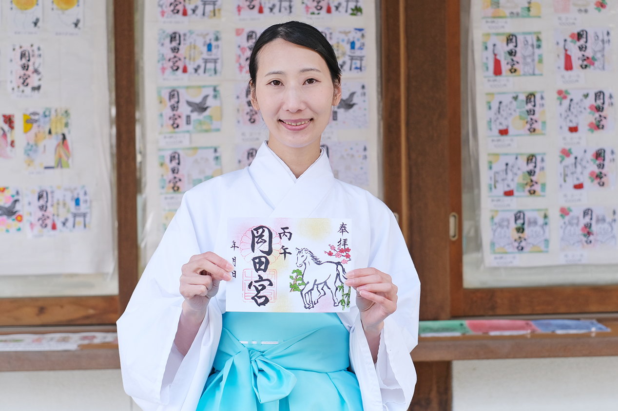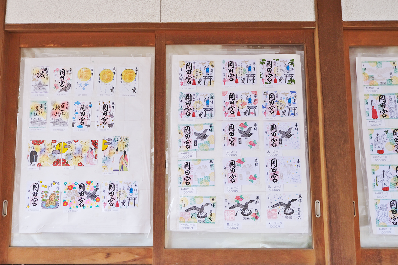 そして「岡田宮」で近年注目を集めているのが御朱印です。もともとはシンプルなもの1種類だったそうですが、現在は約100種類が用意されていて、毎月約60種類が入れ替わるほど多種多彩な御朱印を受けることができます。