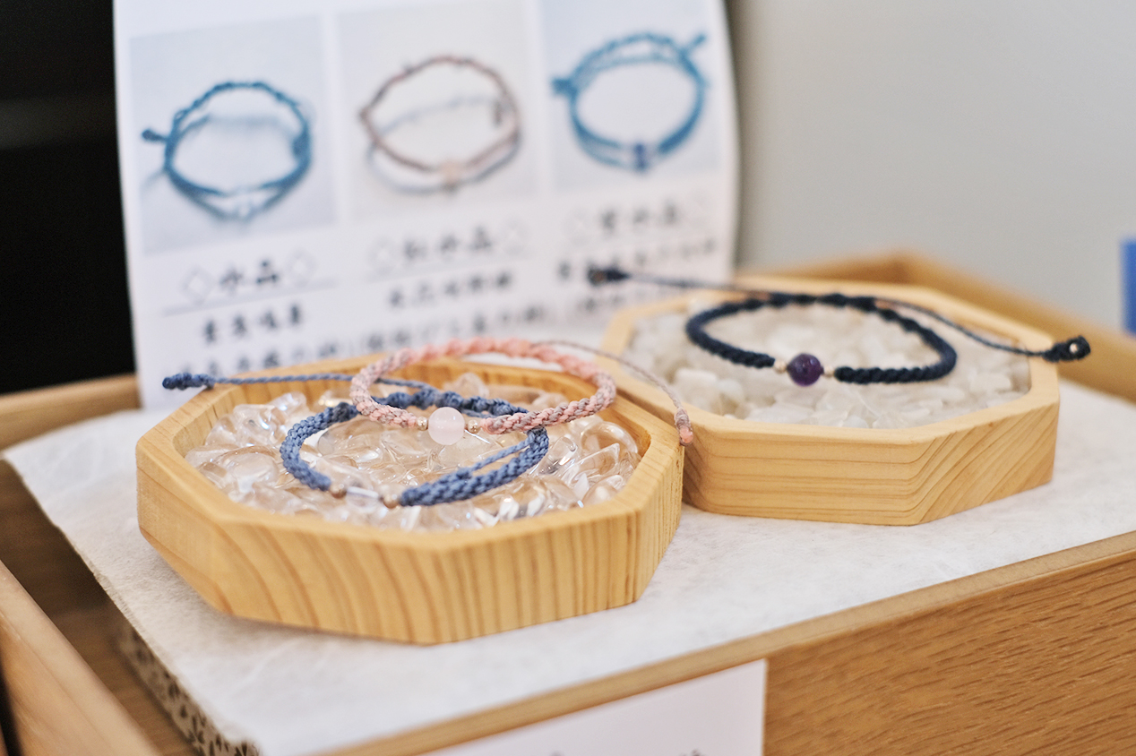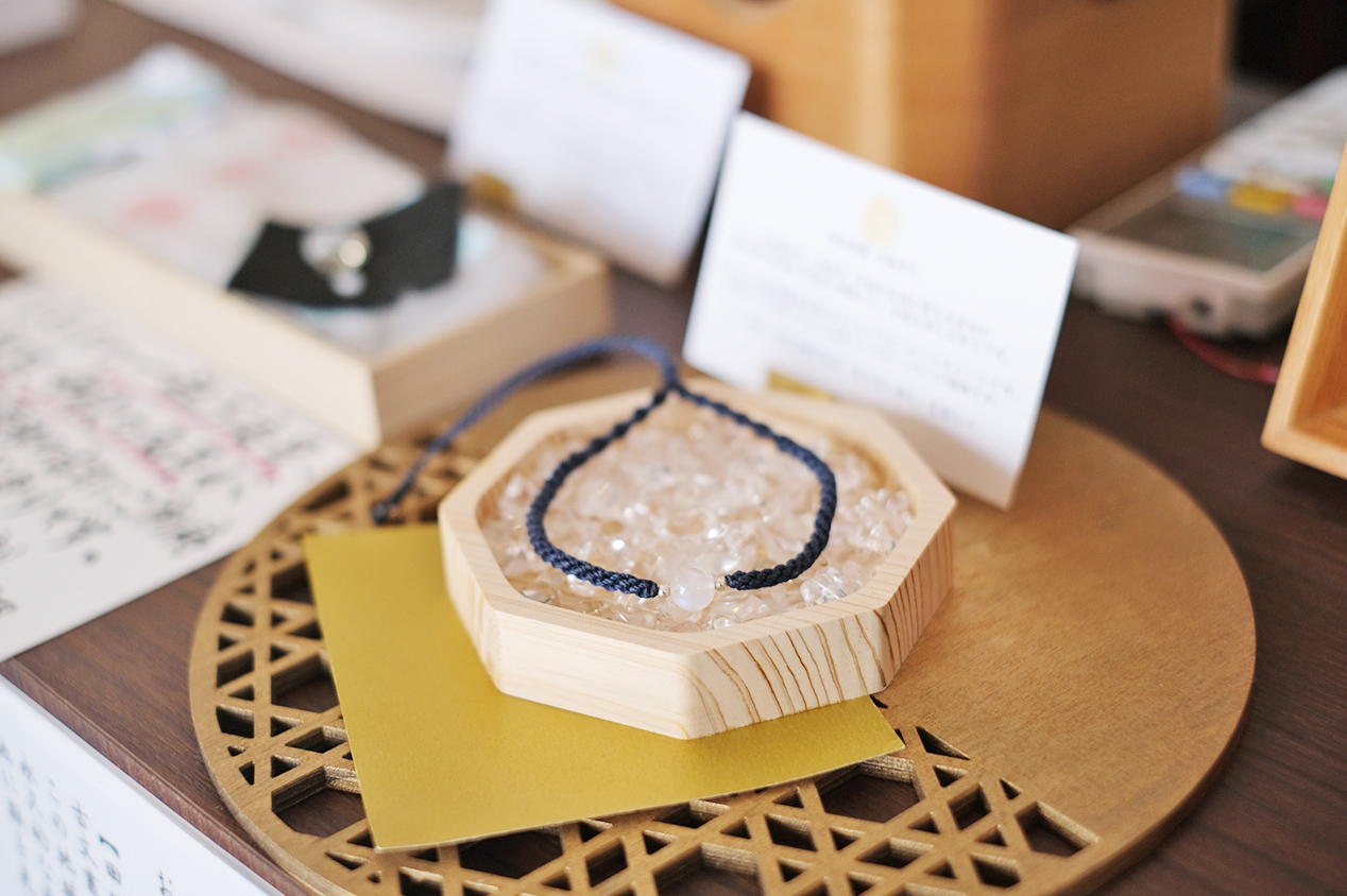 身に着けるブレスレットタイプの御守りも、普段の装いになじむおしゃれな印象です。