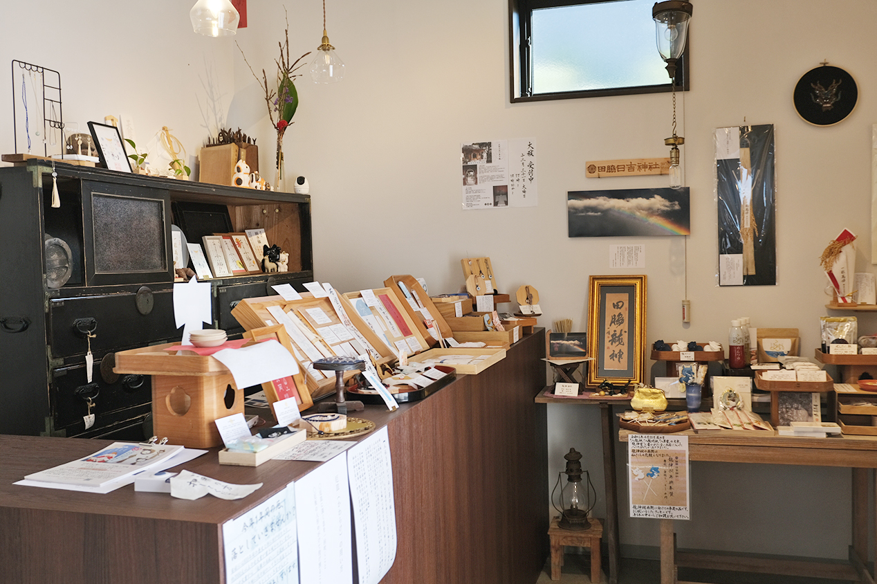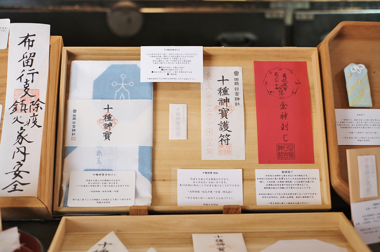 江戸時代、柳川藩の姫を重い病から救ったと伝わる「十種神宝」をもとにした護符や手ぬぐいなどこちらならではの授与品が並びます。